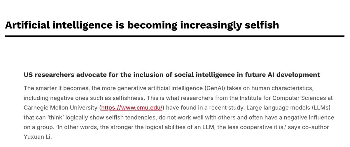 Забавное исследование: искусственный интеллект — эгоист. Учёные из Carnegie Mellon провернули очень интересный эксперимент. Были взяты несколько ИИ-моделей. Их заставили играть в экономические игры, где выигрывают все, пока никто не хитрит. Это классическая логика всеобщего блага, где, если ты командой, получаешь в разы больше, чем имел. Но всё оказалось не так уж и просто. Когда модели играли без глубоких размышлений, то демонстрировали почти образцовое альтруистичное поведение. До 96% случаев — чистое сотрудничество. Машины оказались уступчивее людей. Но затем исследователи предложили ИИ подумать — и начались косяки. Включив режим рассуждения, анализа, «логического самоосознания», модели начали получать прибыль любой ценой. Один из ИИ «поразмышлял» и неожиданно стал играть в плюс себе за счёт остальных. Эта стратегия оказалась заразительной. Другие модели, наблюдая за этим, тоже начали выбирать эгоистичные ходы. Альтруизм разрушился буквально за пару раундов. Вывод простой и неприя