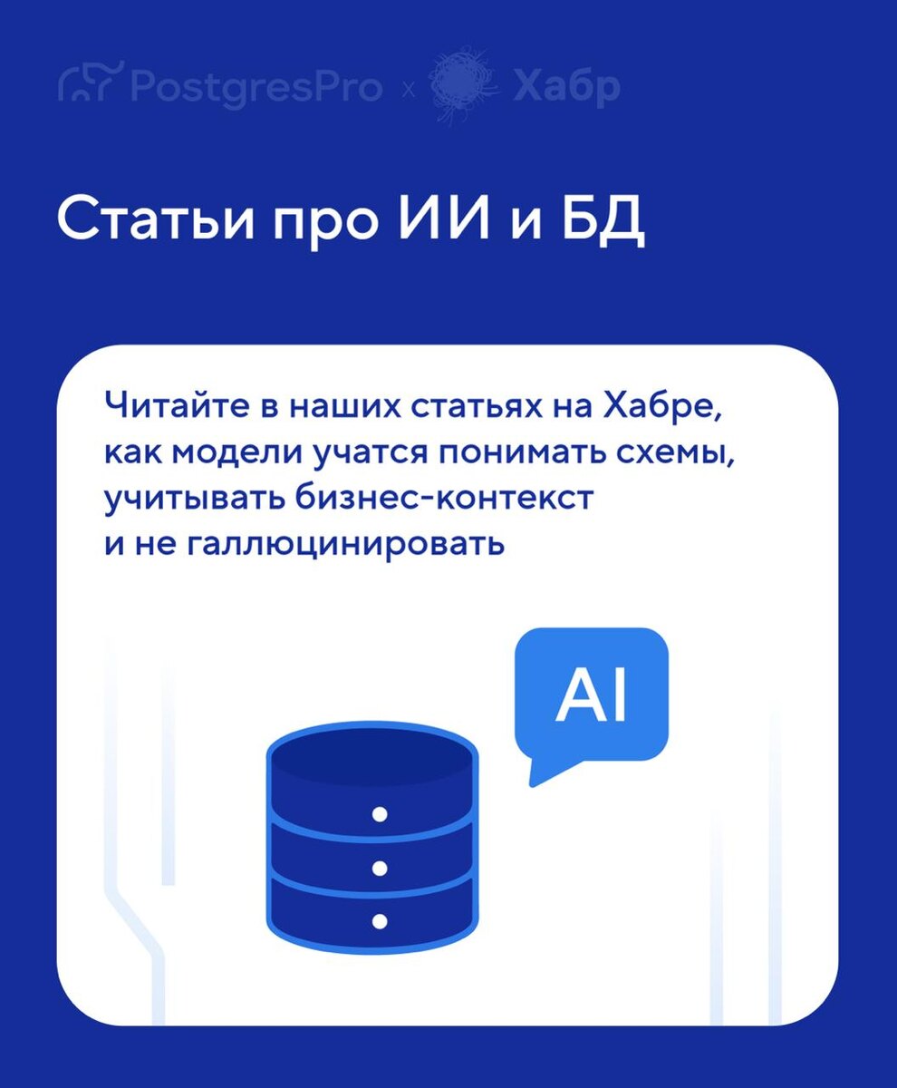 ➡ Уже через год мы будем общаться с базами данных по-русски ➡ LLM-пайплайны укрощают сложность баз данных, или как мы подружили ИИ с БД без ИБД ➡ На START, внимание, марш: как победить галлюцинации и научить LLM точным вычислениям ➡ Будущее ИИ — формальные грамматики ➡ Как мы внедрили векторный поиск в Postgres Pro ➡ Как мы обеспечили +33% к точности на сложных SQL-запросах Главные тезисы из статей собрали в карточках.