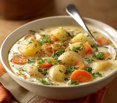 Все нужные продукты собраны. Начинаем готовить вкусное овощное рагу. 1. Тщательно вымойте и почистите картофель щеткой. В зависимости от размера их можно оставить целыми или разрезать пополам. Очистите морковь и нарежьте ее ломтиками толщиной около 0,5 см. Очистите и мелко нарежьте лук и чеснок. 2. В большой кастрюле или глубокой сковороде разогрейте сливочное или растительное масло на среднем огне. Обжарьте в нем лук и чеснок до образования п