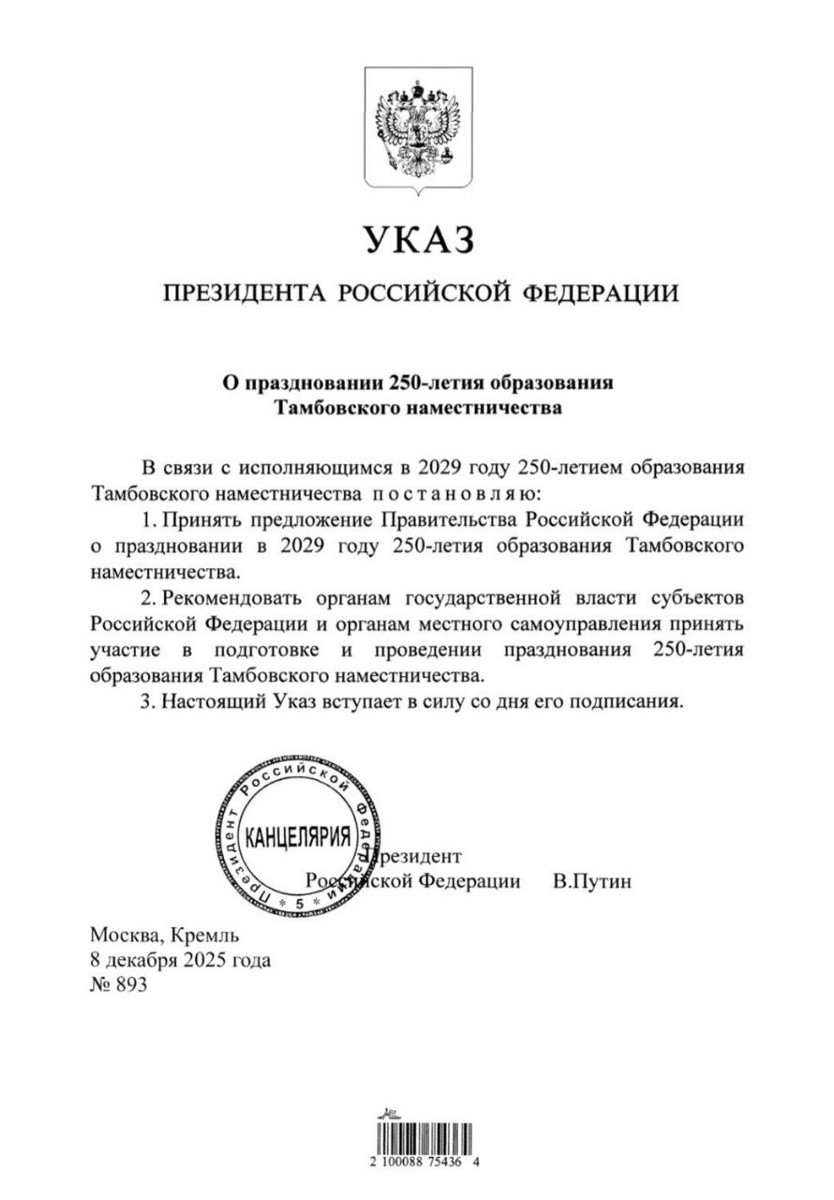 Владимир Путин подписал указ о праздновании 250-летия Тамбовского наместничества. Президент России Владимир Путин подписал указ о праздновании в 2029 году 250-летия образования Тамбовского наместничества. Согласно документу, к подготовке и проведению юбилейных мероприятий будут привлечены региональные и местные органы власти. История Тамбовского края берет свое начало с малоосвоенных земель Русского царства. В XVII веке здесь были построены города-крепости Козлов (ныне Мичуринск) — в 1635 году, и Тамбов — в 1636 году. Первоначально территория делилась на Тамбовский и Козловский уезды. В начале XVIII века, после реформ Петра I, эти уезды вошли в состав Азовской, а затем Воронежской губернии. Только в 1779 году была создана самостоятельная административная единица — Тамбовское наместничество. С 1796 года появилась Тамбовская губерния площадью 66,5 тысячи квадратных километров, включавшая 12 уездов. Губерния просуществовала почти без изменений до 1928 года, когда был осуществлен переход