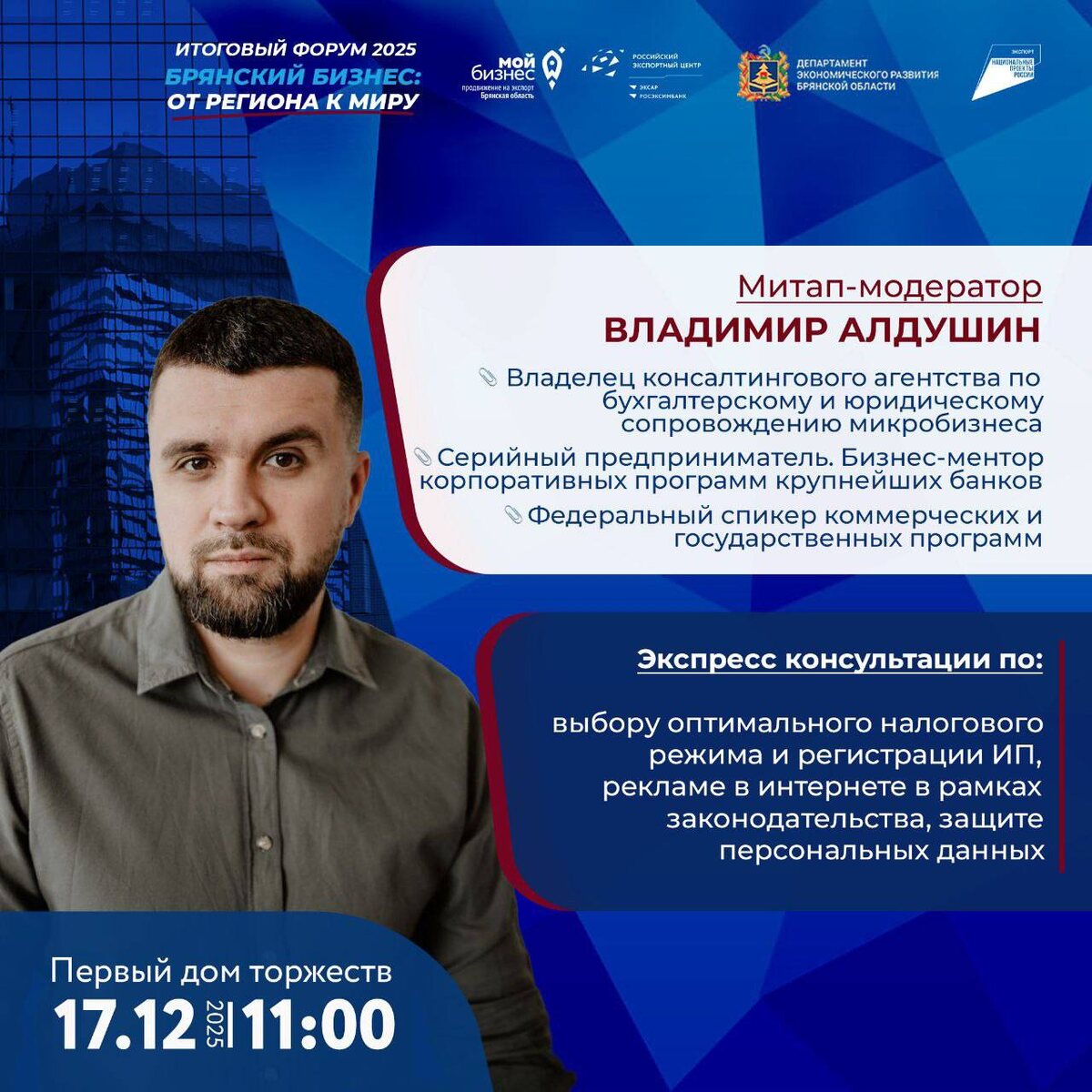2️⃣ БРЯНСК: Итоговый форум 2025 «Брянский бизнес: от региона к миру» Это итоговая конференция от «Мой бизнес», которую я очень рекомендую посетить всем предпринимателям города. Ожидается суперзвездный состав спикеров, будет очень масштабно и интересно! 🗓 Когда: 17 декабря в 11:00 📍 Где: Первый дом торжеств 📍 Моя роль: Митап-модератор + эксперт. Я буду проводить экспресс-консультации по трем ключевым темам: • Выбор налогового режима и регистрация ИП. • Реклама в интернете: как не нарушить закон. • Защита персональных данных. 🔗 https://forms.yandex.ru/cloud/6925b55d1f1eb58571ef19e1 Друзья, места на консультации ограничены таймингом мероприятий, поэтому записывайтесь заранее. До встречи в офлайне! 👋