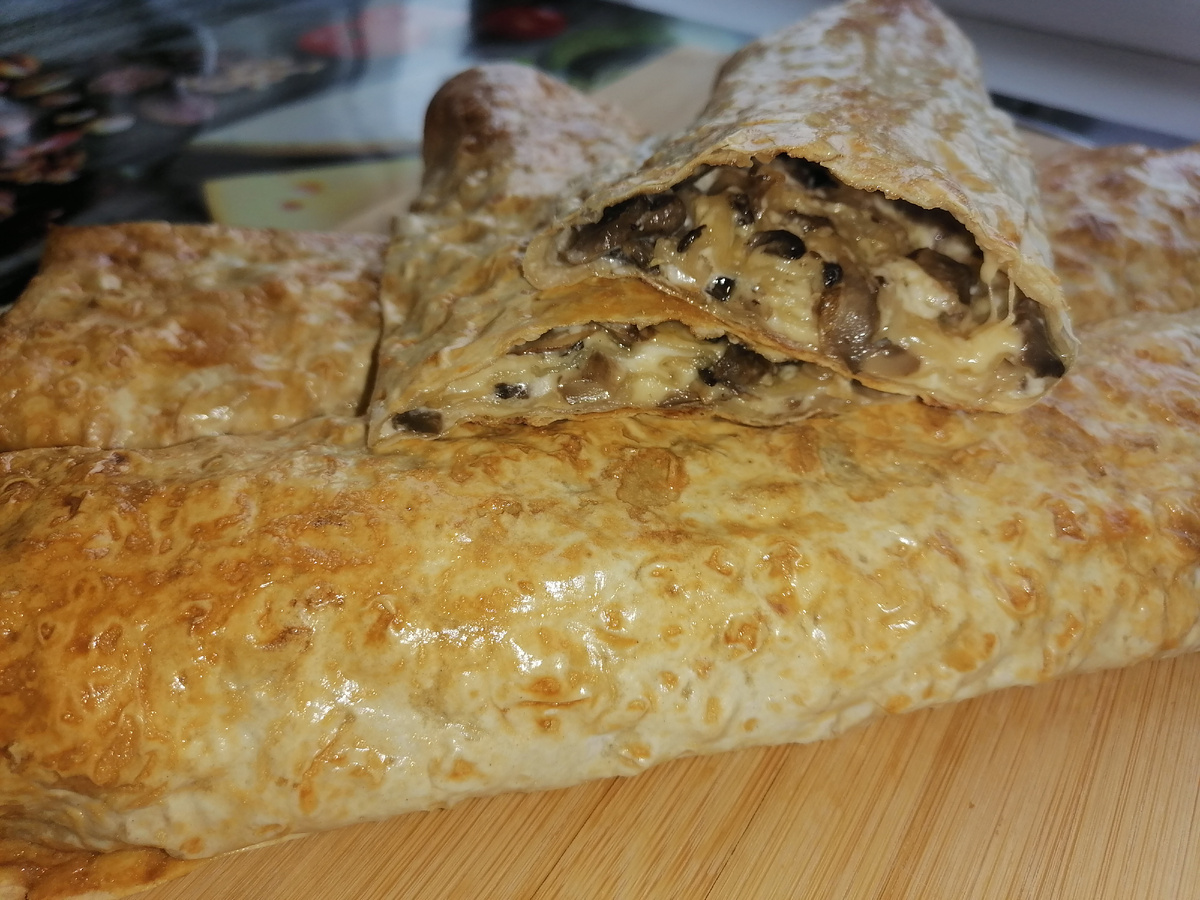 Рулет из лаваша с начинкой из сыра и шампиньонов запечённый в духовке