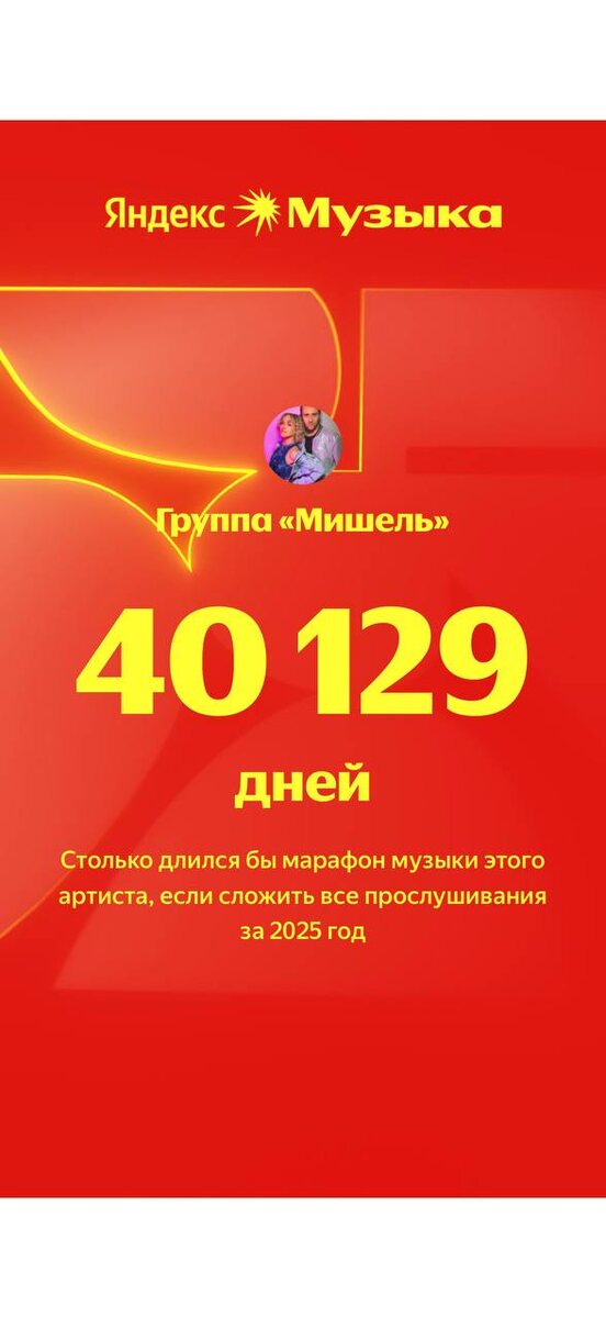Отчёт за 2025 год на Яндекс-музыке❤️ Спасибо, что слушаете наши песни🥰🫶🏼 Мы вас очень любим🥹💔 Кстати, вот наша страничка в Яндекс-музыке: https://music.yandex.ru/artist/418425?utm_medium=copy_link Эти показатели - только начало! Мы уверены, что следующий год будет еще круче и плодотворнее!🔥Готовим для вас столько шикарного материала, что сами не знаем, как всё успеть!🤩