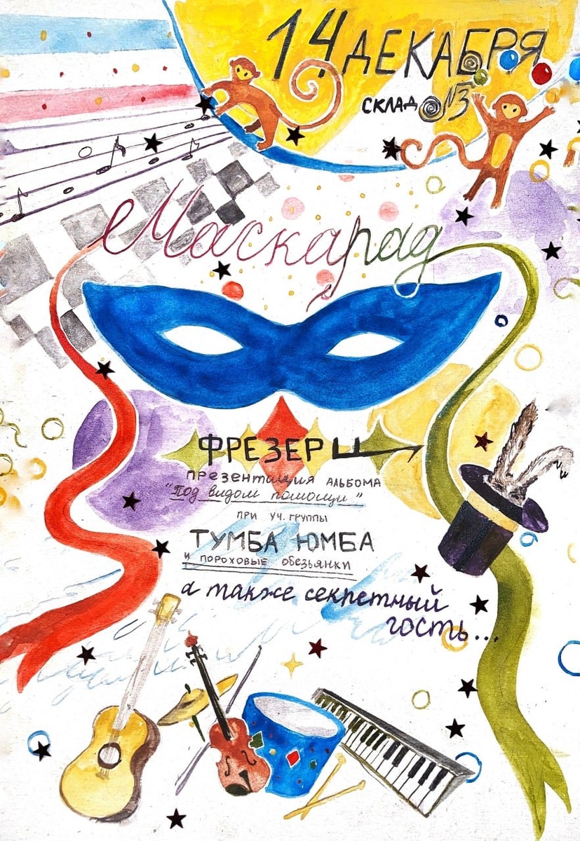 Москва ● Склад №3 ● 14.12 (Вс) ● 19:00 #avantgarde #emo #indie #pop ► Маскарад: Презентация альбома группы «фрезер ц» ● VK Презентация нового альбома группы фрезер ц «под видом помощи»! Вечер танцев, масок и костюмов Участники: ► фрезер ц ● TG ● VK ► Тумба-Юмба и пороховые обезьянки ● TG ● VK ► Нелюдимка ● TG ● VK Билеты от 600₽