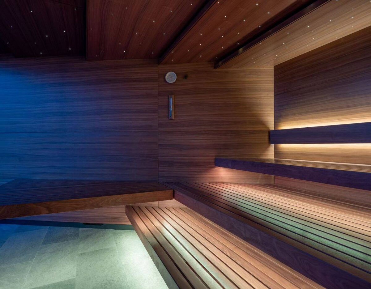 Владельцы частного дома в Баварии мечтали о собственной спа-зоне и в конце концов исполнили свою мечту. Теперь у них есть сауна, из которой открывается великолепный вид на окрестности, хаммам и джакузи. Проектированием, строительством и комплектацией спа-зоны занимались специалисты из компании KLAFS. Для облицовки сауны была выбрана древесина американского ореха глубокого темно-коричневого цвета. При этом сауна не смотрится мрачно: панорамное окно с видом на сад уравновешивает интерьер. Эффект “звездного неба” придает сауне особенный уют и притягательность. При этом потолок многоуровневый, это привлекает внимание всех, кто приходит попариться. По соседству с парной находится хаммам, облицованный мозаикой, а на террасе установлен спа-бассейн с гидромассажем. Зона отдыха, прилегающая к сауне, отделана той же древесиной американского ореха, что придает всему интерьеру целостность.
