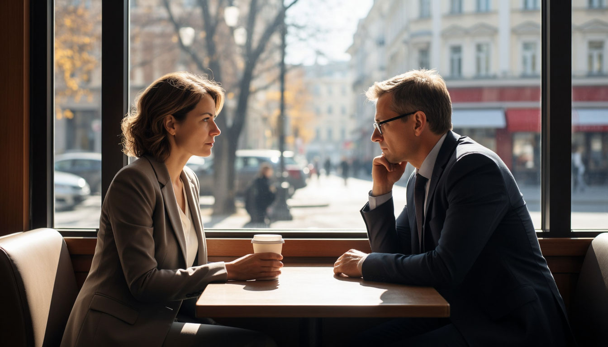В реальности Маша пришла в строгом костюме, заказала американо без сахара и держалась подчёркнуто дружелюбно, но отстранённо.