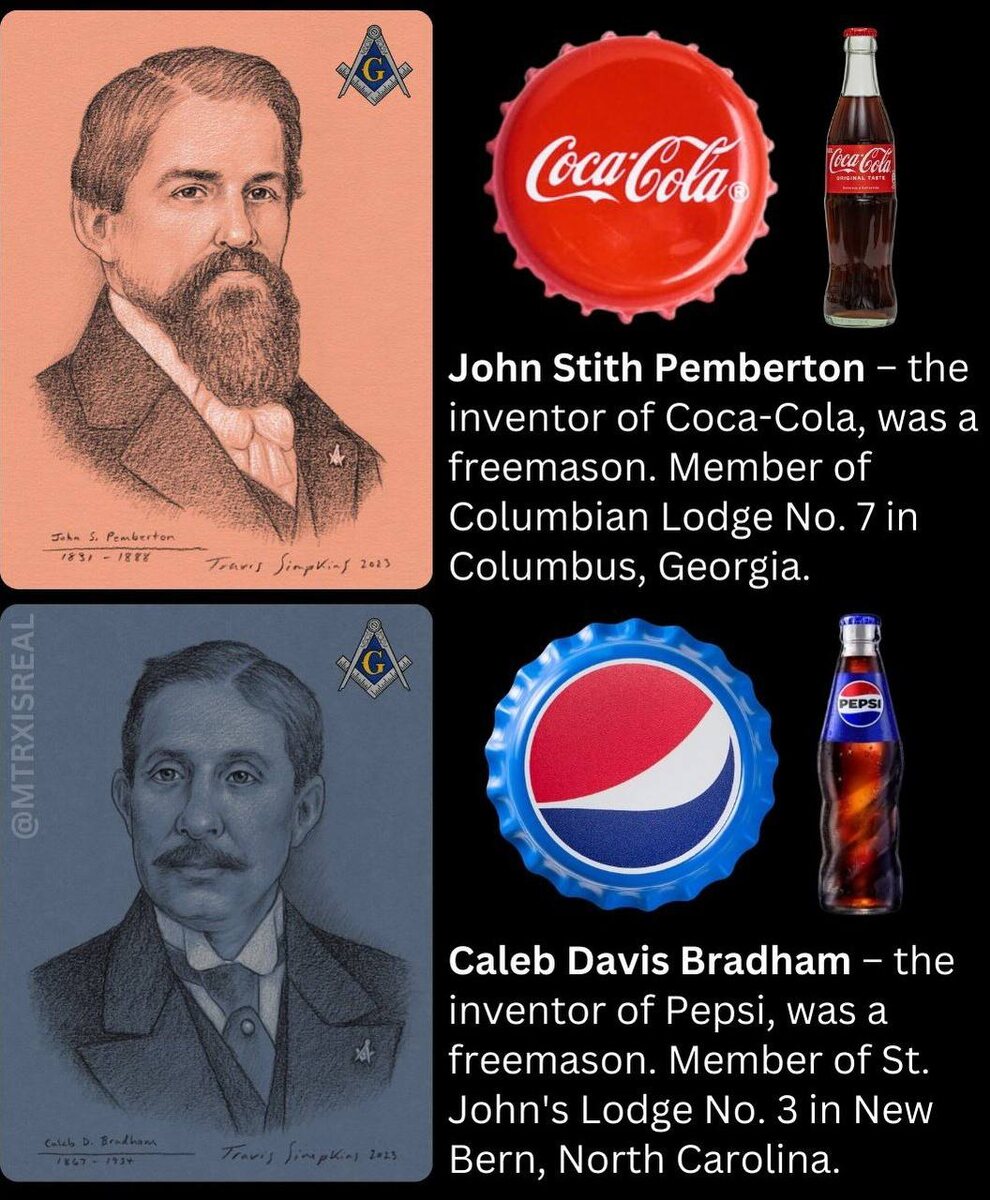 Джон Пембертон (изобретатель Coca Cola) и Калеб Брэдхем (изобретатель Pepsi) – оба были масонами. 👀Пембертон – член Колумбийской ложи No.7 в Колумбусе (Джорджия) 👀Брэдхем – член ложи Святого Иоанна No.3 в Нью-Берне (Северная Каролина) У кого-то все еще есть сомнения, что настолько успешные люди стали таковыми благодаря счастливой случайности? Или длительному упорному труду, как нам любят рассказывать в официальном нарративе? Не было никакого "внезапного взлета" и никакой настоящей конкуренции между двумя брендами. Была лишь заранее подготовлена удобная "история успеха" и тщательно срежиссирована иллюзия: бренды, выбор, соперничество… А доверчивые люди "голосуют" за тот или иной напиток (да, параллель с голосованием и партиями намеренная), сами по своей воле выбирая то, что приводит к подрыву их здоровья и жизни.