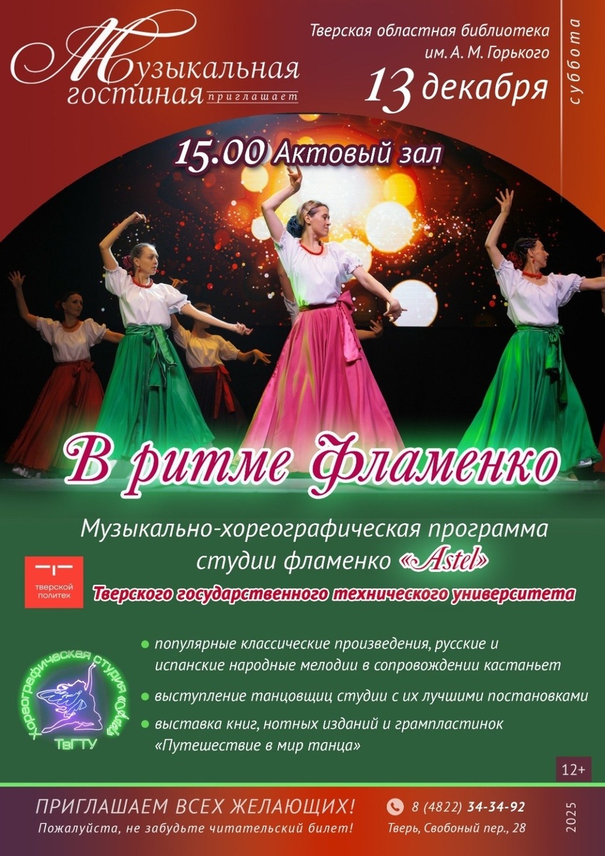💃Хореографическая студия «Эстель» ТвГТУ приглашает на концертную программу Зрителей ждёт путешествие в мир музыки и танца: 💫популярные классические, русские и испанские народные мелодии; 💫зажигательные выступления танцовщиц студии в лучших традициях фламенко; 💫магия ритма кастаньет — простого, но удивительно выразительного инструмента, который станет сердцем нашего вечера. 💫сотрудники отдела литературы по искусству подготовят к концерту тематическую выставку книг, нот и DVD. 📆Путешествие по миру музыки и танца «В ритме фламенко» состоится 13 декабря 2025 года в 15.00 в актовом зале Тверской областной библиотеки им. А.М. Горького. #ТвГТУ #Политех #Эстель_ТвГТУ