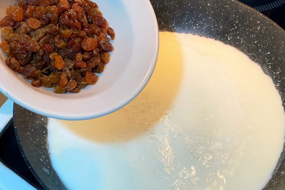 Изюм мгновенно становится мягким, пухлым, как будто впитывает молочную сладость — вот зачем всё это затевалось!