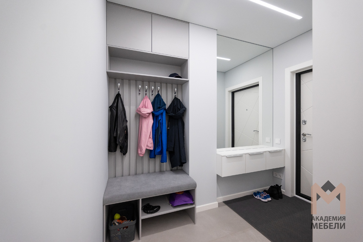 В прихожей собраны все нужные функции: зона для верхней одежды, место для сидения и хранения обуви, зеркало и консоль. Основу составляет компактная система с мягкой скамьёй, вертикальными панелями с крючками и верхним модулем для сезонных вещей. Корпус выполнен из Egger «Рейн» и «Белый премиум», что даёт нейтральный серо‑белый фон и хорошо сочетается с серым интерьером.