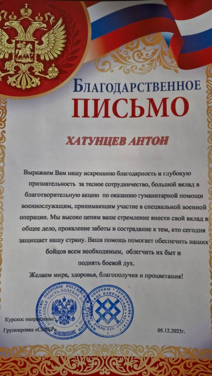 Парни прислали письмо благодарственное , очень приятно , но не обязательно. За 3 недели мы намотали 14000 тысяч километров на машине, очень вымотался, но результаты вдохновляют. Сейчас я проработал всю границу фронта по всем прифронтовым областям, теперь есть твердые контакты и понимание кому , что необходимо . Уже отправлено несколько рейсов с гуманитарной помощью в виде медикаментов , одежды, продукты питания, противодронные рыболовные сети ( 10 км), два мотоцикла, многое другое. Силами нашей организации, мною , моей командой сформирована сеть контактов для взаимодействия, очень важно - проверенные. Теперь нужно отдохнуть несколько дней и начинаем системно работать. Огромная благодарность моему окружению за разную поддержку на высоком уровне ! Всех обнимаю , желаю скорейшей победы , мирного неба над головой ! #сво #командапутина #народныйфронт #антонхатунцев