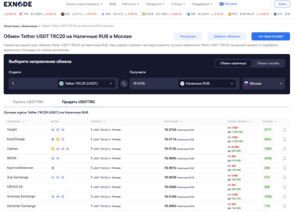 Чтобы выбрать надёжный сервис, пользователи обращаются к мониторингу Exnode, где собраны проверенные криптообменники в Москве. На платформе отображаются актуальные курсы, комиссии, адреса офисов и рейтинг репутации. Это помогает сразу определить подходящую точку и избежать сомнительных предложений.