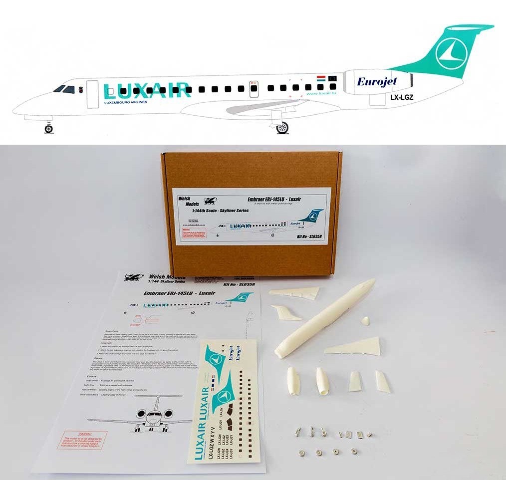 Английская Welsh Models выпустила модельEmbraer ERJ-145LU в масштабе 1/144 из полиуретановой смолы с декалью авиакомпании Luxair: Embraer ERJ-145LU Luxair (каталожный номер SL635R)