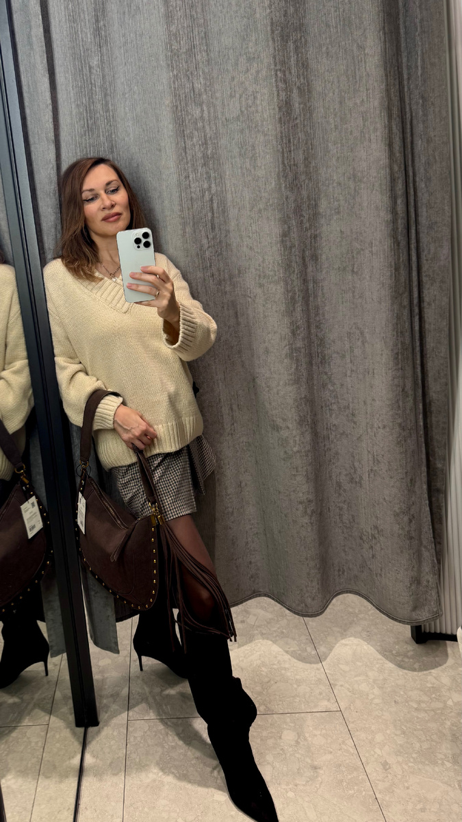 В преддверии зимней распродажи ,я отыскала для вас настоящие жемчужины в масс-маркете. На этот раз я заглянула в магазин Lime и составила три стильных и комфортных аутфита. Образ 1 Этот образ — идеальное сочетание стиля и удобства для прохладного дня! Я выбрала вязаный свитер оверсайз в оттенке «сливочное масло» как основу своего образа. Свободный крой придаёт ощущение уюта, а нежный цвет добавляет лёгкости и свежести. Этот свитер легко сочетается с различными элементами гардероба и является частью брючного трикотажного костюма. Однако вместо брюк я предпочла клетчатую мини-юбку, которая отлично дополнила мой образ. Классический узор придаёт образу ретро-шарм, а укороченный крой вносит динамичность. Хотя было бы удобнее, если бы это была юбка-шорты, замшевые сапоги цвета эспрессо завершают ансамбль. Они визуально удлиняют ноги и делают силуэт более изящным. Несмотря на шпильку, мне было комфортно в них. Плотные колготки в трендовом цвете мокко идеально дополняют образ. Для тепла п
