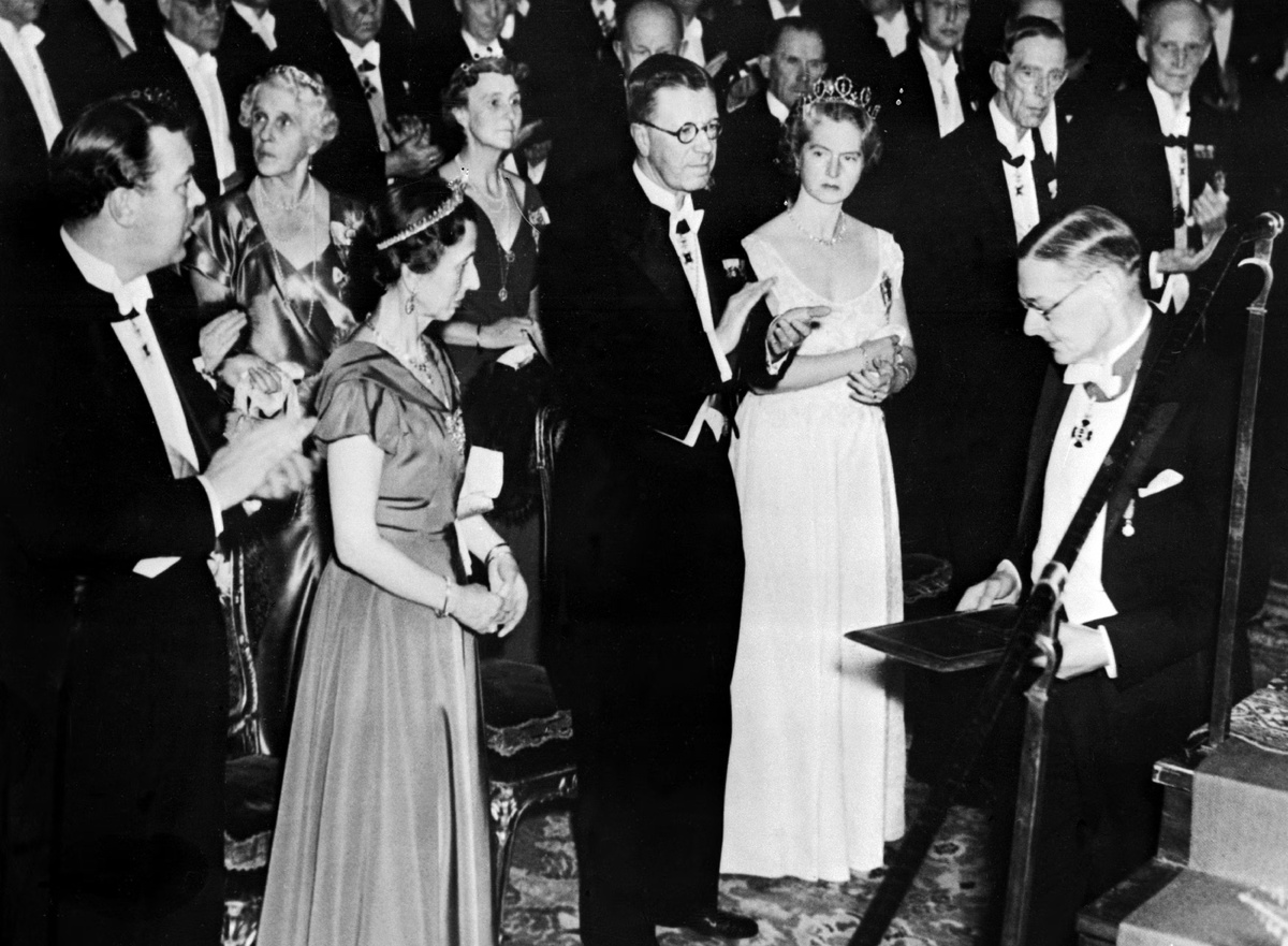 Начиная с 1901 года, Нобелевские премии вручаются 10 декабря, в годовщину смерти Альфреда Нобеля. Как и было указано в завещании Нобеля, премии по физике, химии, физиологии или медицине, а также литературе вручаются в Стокгольме, Швеция, а Нобелевская премия мира – в Осло, Норвегия. На обеих церемониях присутствуют члены королевских семей Швеции и Норвегии. В прошлой статье я более подробно писала об этих церемониях, а здесь предлагаю посмотреть на исторические фотографии. 1948 Поэт Томас Элиот получает Нобелевскую премию по литературе, а члены королевской семьи ему аплодируют. 1949 Уильям Фолкнер получает Нобелевскую премию по литературе 1949 года из рук короля Швеции Густава Адольфа. 1953 Король Густав Адольф с леди Клементиной Черчилль на банкете. Клементина получила Нобелевскую премию по литературе 1953 года от имени своего мужа, сэра Уинстона Черчилля. 1954 Принцесса Сибилла беседует (и курит!) с лауреатом Нобелевской премии Линусом Полингом на банкете в 1954 году. 1957 Корол