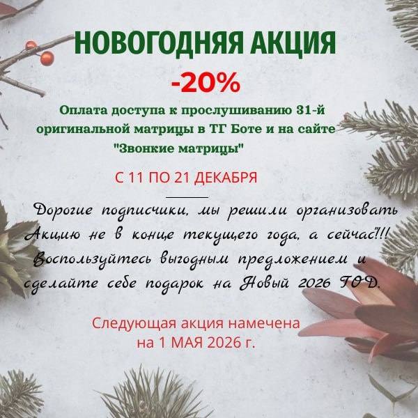 Дорогие подписчики, мы решили организовать Акцию не в конце текущего года, а сейчас"!!! Воспользуйтесь выгодным предложением и сделайте себе подарок на Новый 2026г. 📌 Переходите по ссылке ниже и воспользуйтесь уникальной возможностью продления подписки! Сайт «Звонкие матрицы» https://fizio-vr.ru/ Бот «Звонкие матрицы «https://t.me/fizio_vr_bot