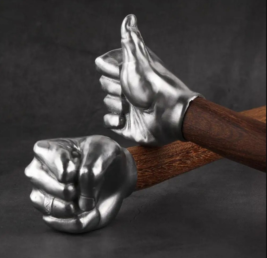 Приветствуем всех, кто постоянно думает о вопросах личной безопасности и тех, кто эти вопросы давно для себя решил, спрятавшись за спинами многочисленных бодигардов. Но как бы то ни было, эта тема всегда волнует, будоражит и вызывает интерес, потому что для этого есть серьёзные причины — инстинкт самосохранения никто не отменял и отменить не может, даже неоправданно гиперактивный и вездесущий в последние годы Роскомнадзор. И этим активно пользуются производители подходящих товаров из обширной ниши по самообороне и выживанию, а так же их ещё более многочисленные помощники-продаваны с различных торговых площадок. Насколько это всё заслуживает внимания, всем и каждому есть возможность высказаться в комментариях. Нетрудно догадаться, это не просто молоток, а настоящая мини-скульптура из металла, сделана довольно качественно и выглядит соответственно. Рабочая часть изготовлена в виде кулака с характерно задранным вверх большим пальцем. Отлично подойдет, чтобы украсить набор рабочих инструм