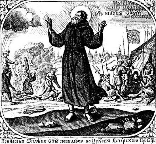Никон Сухой Печерский (конец XI — начало XII века) — преподобный Русской православной церкви, монах Киево‑Печерского монастыря, почитаемый за стойкость в вере и чудотворения. День памяти — 24 декабря (11 декабря по старому стилю). Во время нашествия хана Боняка на Киев монастырь был разорён; Никон вместе с другими иноками попал в плен. Его увезли в чужие земли и держали в оковах. Несмотря на страдания, Никон непрестанно молился и благодарил Бога. Спустя годы бывший хозяин Никона прибыл в Киев для переговоров о мире и посетил Киево‑Печерский монастырь. Увидев своего бывшего пленника, он был потрясён чудом, рассказал обо всём игумену и братии, принял крещение, постригся в монахи, стал послушником у Никона. В период пленения Никон: Прозвище отражает физическое состояние святого после трёх лет мучений: Основное повествование о жизни Никона Сухого содержится в Киево‑Печерском патерике (слово «О Никоне» в Арсеньевской редакции; «О смиреннем и многотерпеливем Никоне черноризце» в Кассиановско