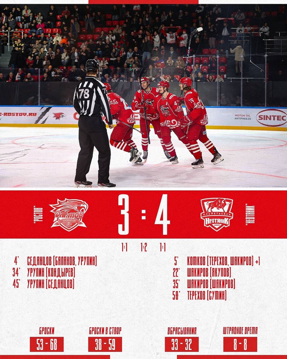 ХК «Ростов» проиграл «Нефтянику» со счетом 3:4 в рамках ВХЛ.