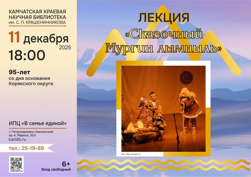 📌 Жителям Камчатки расскажут о Мургин лымӈыле Краевой фестиваль-конкурса сказок коренных малочисленных народов Севера, Сибири и Дальнего Востока «Мургин лымӈыль» проходит по 12 декабря на Камчатке, передает агентство «КАМЧАТКА-ИНФОРМ» со ссылкой на Камчатский центр народного творчества. Так, 11 декабря в 18:00 в Камчатской краевой научной библиотеке им. С.П. Крашенинникова начнется лекция «Сказочный Мургин лымныль» и кинопоказ «История фестиваля сказок «Мургин лымӈыль». Гостям представят хронику зарождения фестиваля, архивные ролики участников прошлых лет, расскажут о людях и коллективах, которые внесли вклад в развитие этого творческого пространства. 12 декабря кульминацией фестиваля станет гала-концерт в концертном зале филармонии. С 17:00 – мероприятия начнутся с работы интерактивных площадок, на которых можно будет выучить слова на языках народов Севера, попробовать говорить за героев северных сказок, нарисовать сказочных героев и выучить их названия на разных языках, поиграт