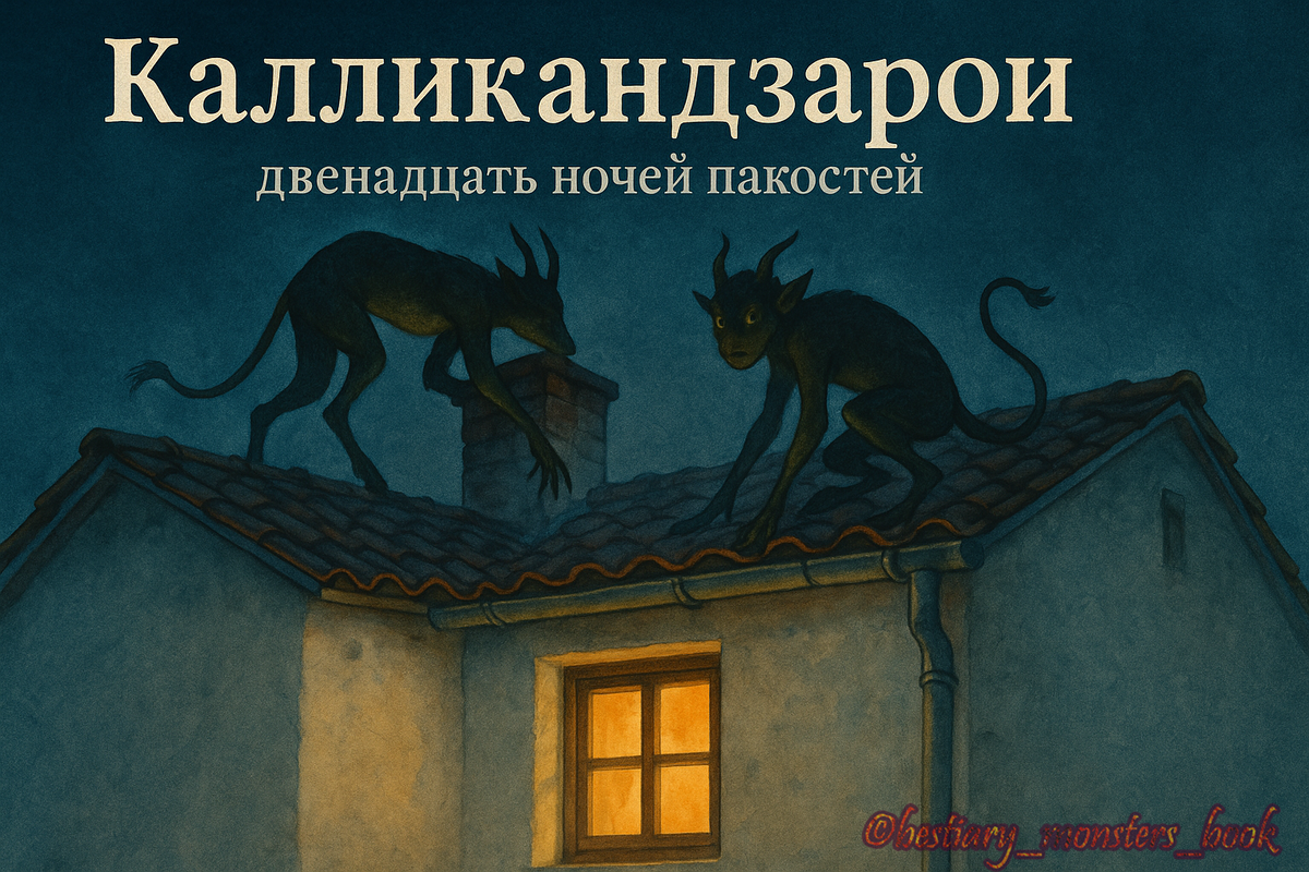 Кого дразнят зимние гоблины — и как их «занять» до рассвета Зимний вечер в греческой деревне пахнет дымом оливы и жареными орехами. В домах огонь не гаснет, на дверях — узелок чеснока, над порогом висит решето/сито. Где-то во дворе раздаётся хихиканье и звук, будто кто-то чиркнул ногтем по черепице. Это калликандзарои — ночные пакостники двенадцати святок: приходят из-под земли, чтобы дёрнуть за косу, стащить колбаску с вертела и проверить, не забыла ли семья про свет, тепло и порядок. Имена и ареал. Их называют καλικάντζαροι (kalikántzaroi), местами — καρκαντζάρηδες, у понтийских греков — ещё вариации. Это зимние гоблины материковой Греции, островов Эгейского моря и греческих общин Малой Азии; параллели встречаются по Балканам. Календарь и сюжет. Их время — Двенадцать дней между Рождеством и Богоявлением (6 января). В сказаниях они живут под землёй, где целый год пилят мировое древо/столб, чтобы обрушить мир. Накануне падения наступают святки — калликандзарои бросают пилу и вылезают