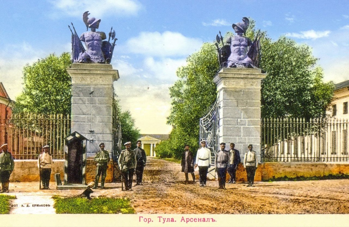 "Тула - арсенал и щит России" Если вы пойдете пешком по улице Арсенальной, то обязательно натолкнетесь на красивые ворота, украшенные фигурами древнеримских преторианцев. Они величественно стоят здесь, как минимум, с середины XIX века. Изначально за воротами находился Оружейный двор, куда с ТОЗа на хранение поступало готовое оружие. В годы Великой Отечественной войны каменные цеха использовали для ремонта автотранспорта. С начала 50-х гг. и по настоящий момент территорию занимает предприятие оборонного комплекса. 📸: @nadyusshhaa
