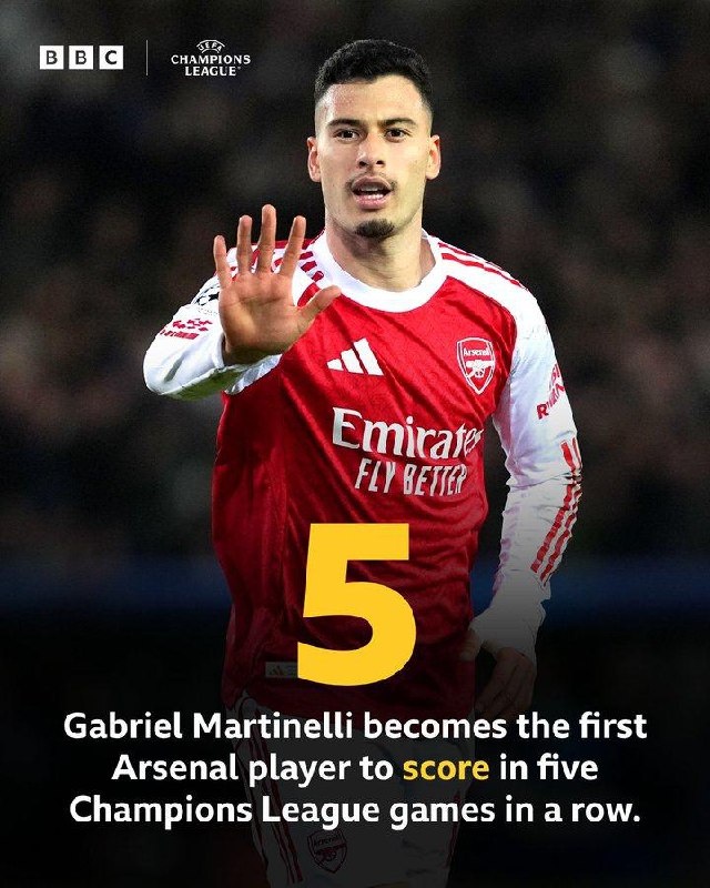 Габриэль Мартинелли — первый в истории игрок, забивавший за "Арсенал" в пяти матчах Лиги Чемпионов подряд 🤌
