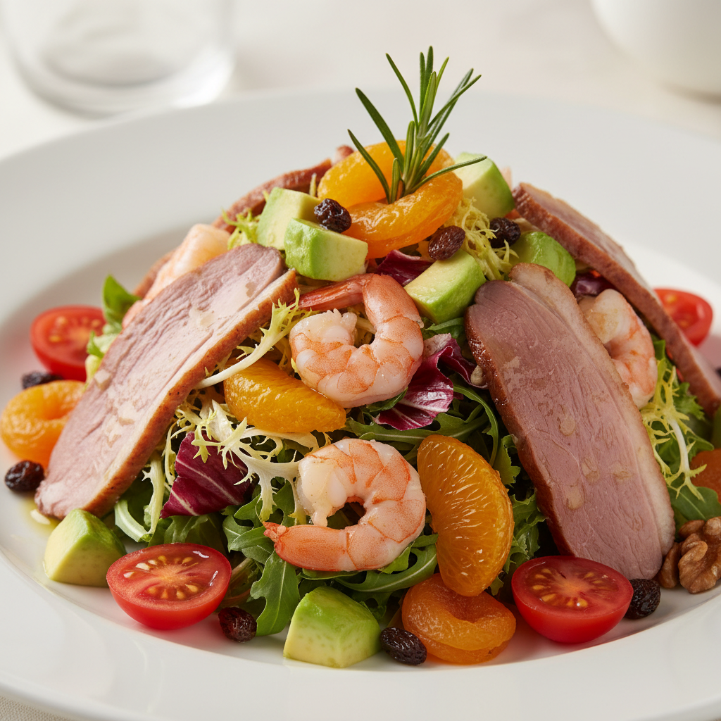 ✨ WOW-эффект при подаче — золотистая палитра ингредиентов символизирует год Лошади Основа: Для заправки: Креветки отварите в подсоленной воде с веточкой розмарина в течение 3 минут после закипания. Сразу же переложите их в ледяную воду, чтобы сохранить упругость и свежесть. Это критически важно для текстуры! Кулинарный лайфхак: если вы используете копченую утку из готовых магазинных наборов, слегка подсушите ломтики на сухой сковороде 30 секунд с каждой стороны —