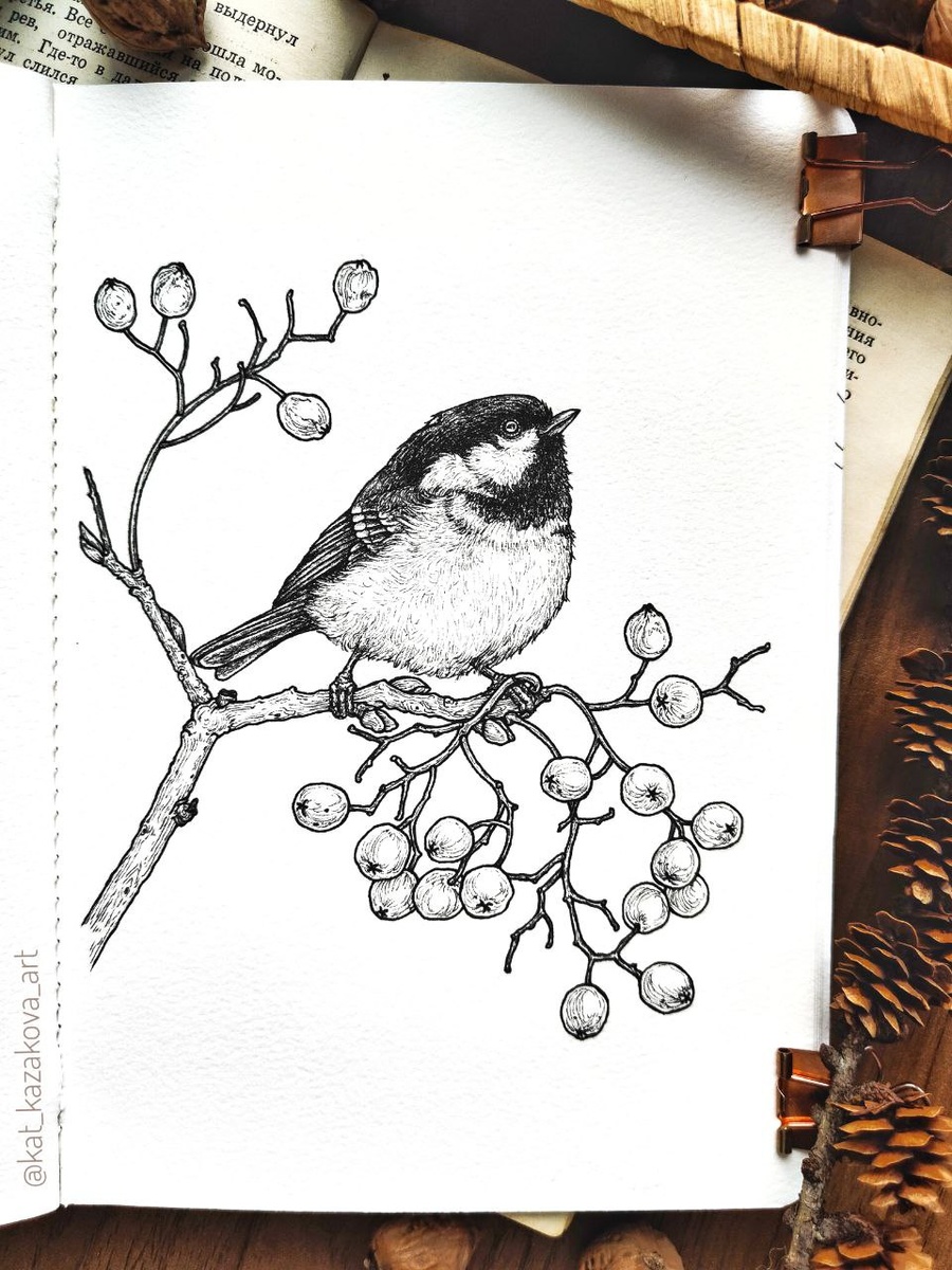 5 советов по рисованию птичек линерами 1. Чем тоньше и светлее перышке, тем тоньше линер: для коротких пёрышек на черной головке птички можно взять 03, а для светлых щечки и пузика - 005. 2. Штриховку наносим в том же направлении, в котором лежат перья: на голове (посмотрите внимательно на референс, чтобы определить это направление). 3. Даже на чёрных частях остаются блики и некоторая фактура, поэтому не надо заливать их сплошным чёрным. 4. Чтобы рисовать птичек точнее, нужно понимать их анатомию. Посмотрите видео, где птицы двигаются, складывают и расправляют крылья, тогда будет проще. 5. Если собираетесь закрашивать монохромный рисунок акварелью, делайте штриховку пореже, не пытайтесь полностью переделать свет и тени, иначе рисунок может получиться слишком тёмным, и акварель будет теряться. - Птичка на рисунке - это московка, или чёрная синица. Я сфотографировала её в городском парке Южно-Сахалинска, там их довольно много около кормушек.
