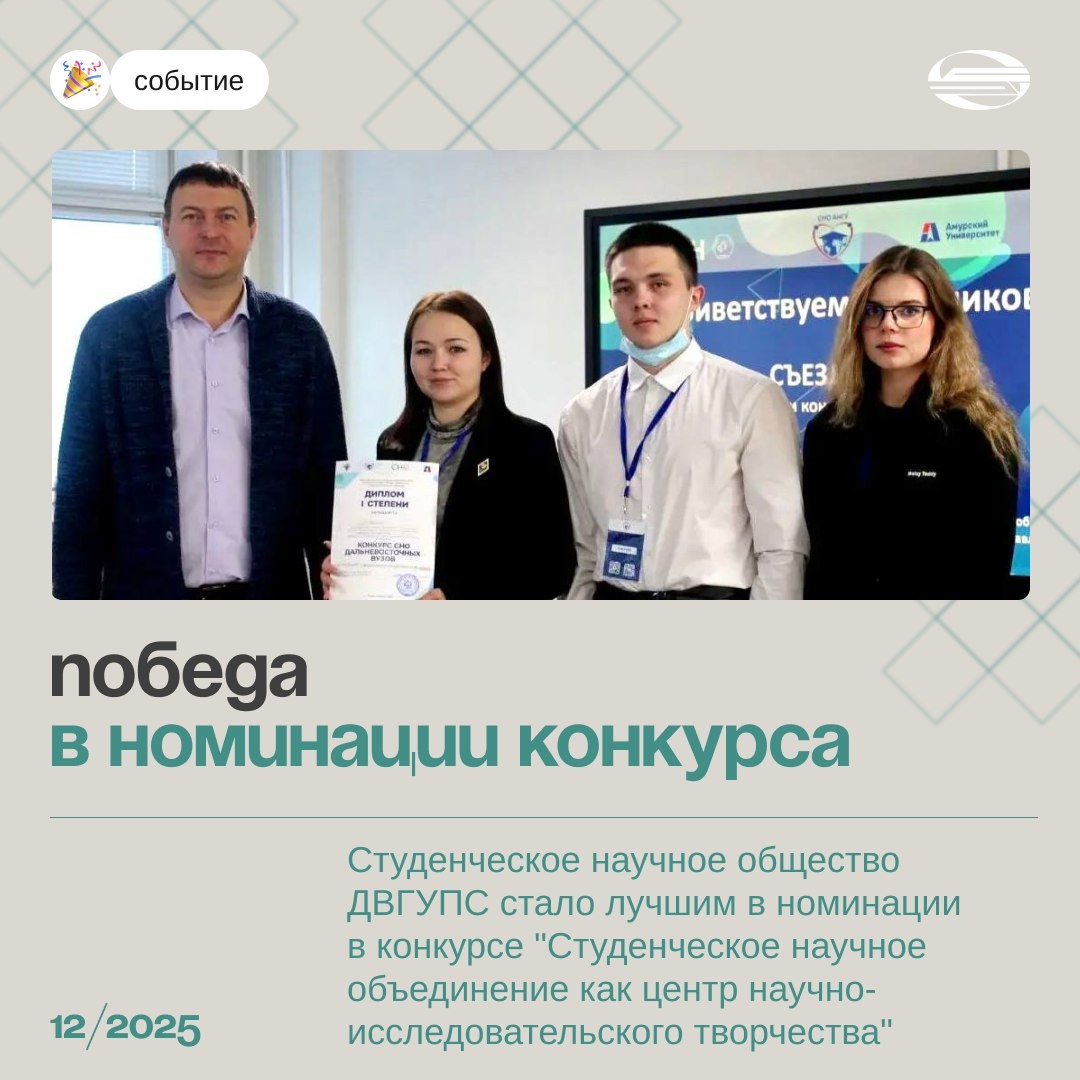 Студенческое научное общество ДВГУПС стало лучшим в номинации «Программа развития и визитная карточка»! 🎞️🎞️🎞️🎞️🎞️🎞️🎞️🎞️ Команда СНО ДВГУПС приняла участие в конкурсе «Студенческое научное объединение как центр научно-исследовательского творчества». Организатором конкурса среди вузов Дальнего Востока России выступает Амурский государственный университет в Благовещенске. Наш университет с докладом о развитии СНО совместно с командой студентов представила заведующая кабинетом отдела научно-исследовательских работ студентов, председатель СНО Университета. Поздравляем с победой🎞️