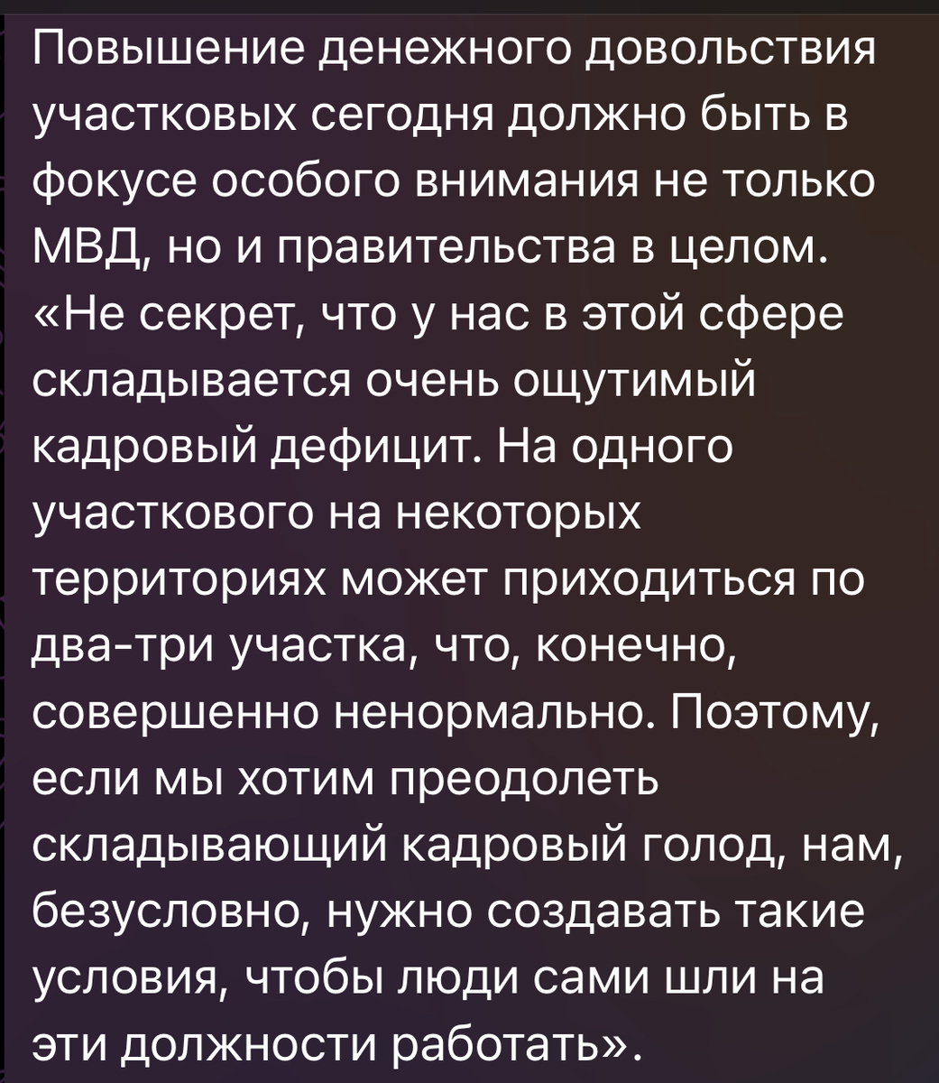 Ментам Дед Мороз к Новому году подарки принёс. С января им повышают ДД. Так следователям, участковым, ПДН и другим увеличивают надбавку за условия службы плюсом 15- 20 процентов к ныне действующей. Правда, ментопенсам от этого ни холодно, ни жарко. МВД опубликовало проект приказа. Сейчас он проходит стадию обсуждения — до 24 декабря. Некоторым счастливчикам прибавка будет 35 процентов. Сообщила "Парламентская газета" и депутат из комитета по безопасности. Фамилию не помню, поищи в тырнете. Этой новостью поделился Николай Ковылин в теме: Николай вспомнил депутата, так вот он: Член Комитета Госдумы по безопасности и противодействию коррупции Андрей Альшевских сказал: И по проекту приказа. Действительно, на портале обсуждения нормативных актов выложен проект приказа министра МВД. Ниже скриншот проекта приказа: Этот проект дополняет (изменяет) некоторые пункты приказа министра внутренних дел за: N 350 от 20.06.2024 года "О перечне сотрудников МВД которым выплачивается надбавка