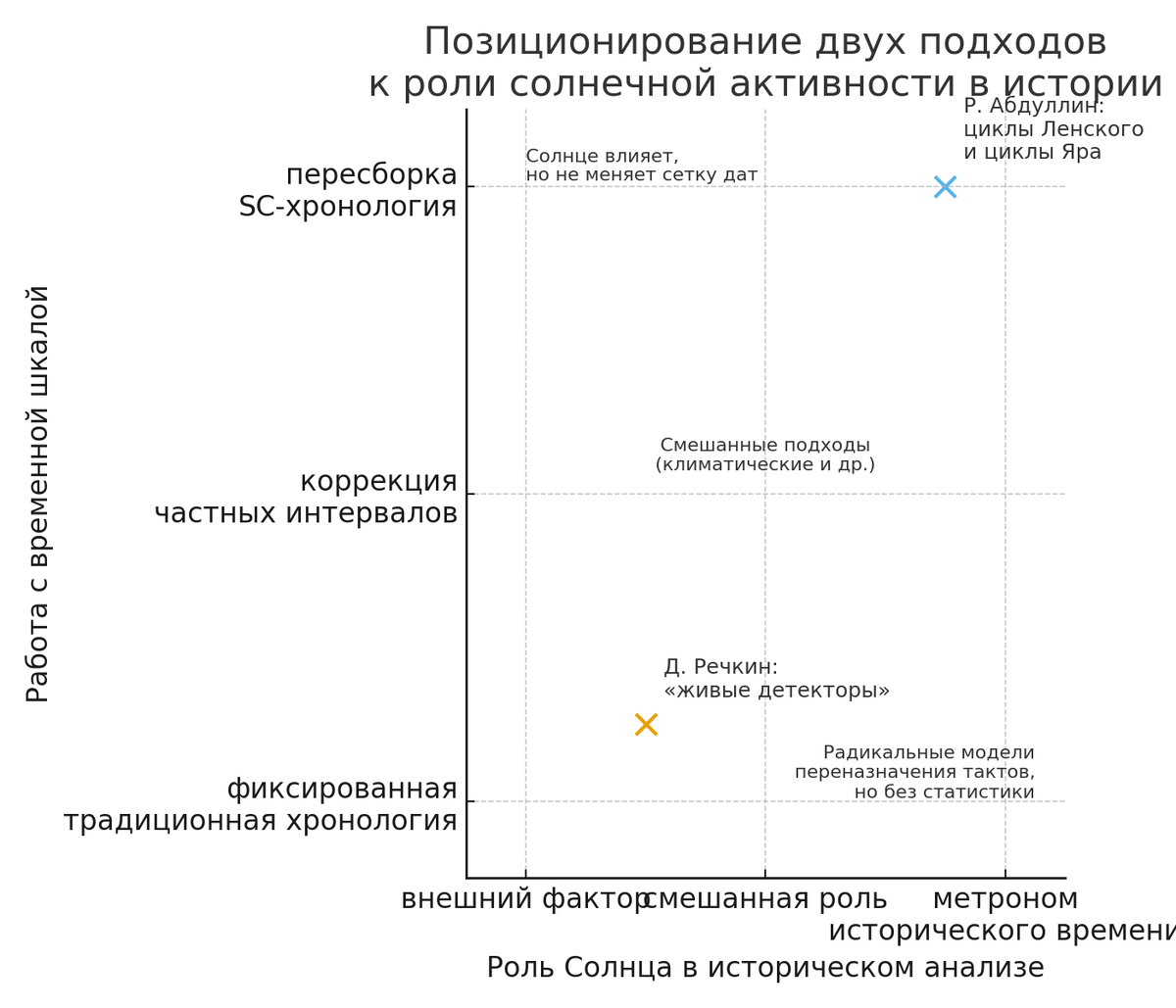 На этом фоне точка Р. Абдуллина занимает особое положение: она совмещает стремление к переопределению тактов исторического времени с привязкой к реально измеряемым солнечным циклам, а точка Д. Речкина подчёркивает важность того статистического фундамента, без которого любая пересборка хронологии превращается в произвольную спекуляцию.