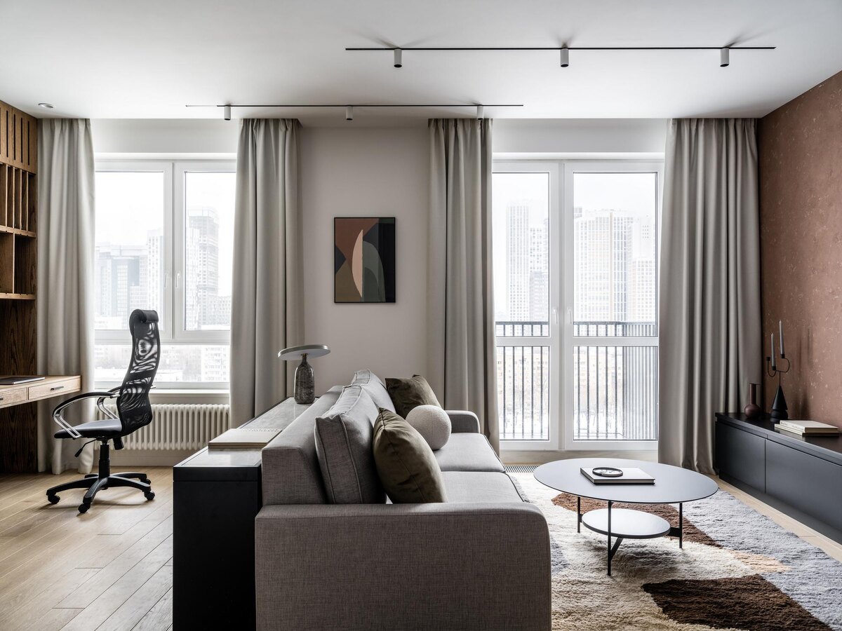 Эта квартира на набережной Москвы-реки создана для молодого человека. Архитекторы решили поддержать вдохновляющий вид из окон натуральными фактурами, нейтральными оттенками и простыми формами, оставив в пространстве только самое необходимое. Графичный интерьер с мужским характером Главным пожеланием заказчика, по словам дизайнеров, был светлый, легкий, минималистичный интерьер с добавлением дерева и с использованием стойких к износу материалов. Поэтому дизайнеры решили оформить интерьер в нейтральных оттенках с небольшим добавлением цвета. Так как интерьер мужской, хотелось добиться чуть более графичного характера, а также интегрировать в пространство сочетание гладких и более грубых поверхностей. Конкретные оттенки уточняли уже в процессе работы. «Нам хотелось создать интерьер, отражающий образ амбициозного молодого человека, оформить пространство, которое бы тонизировало, придавало сил и энергии», — рассказывают авторы проекта. Зачем в минималистичный интерьер добавлять ковер Сдер