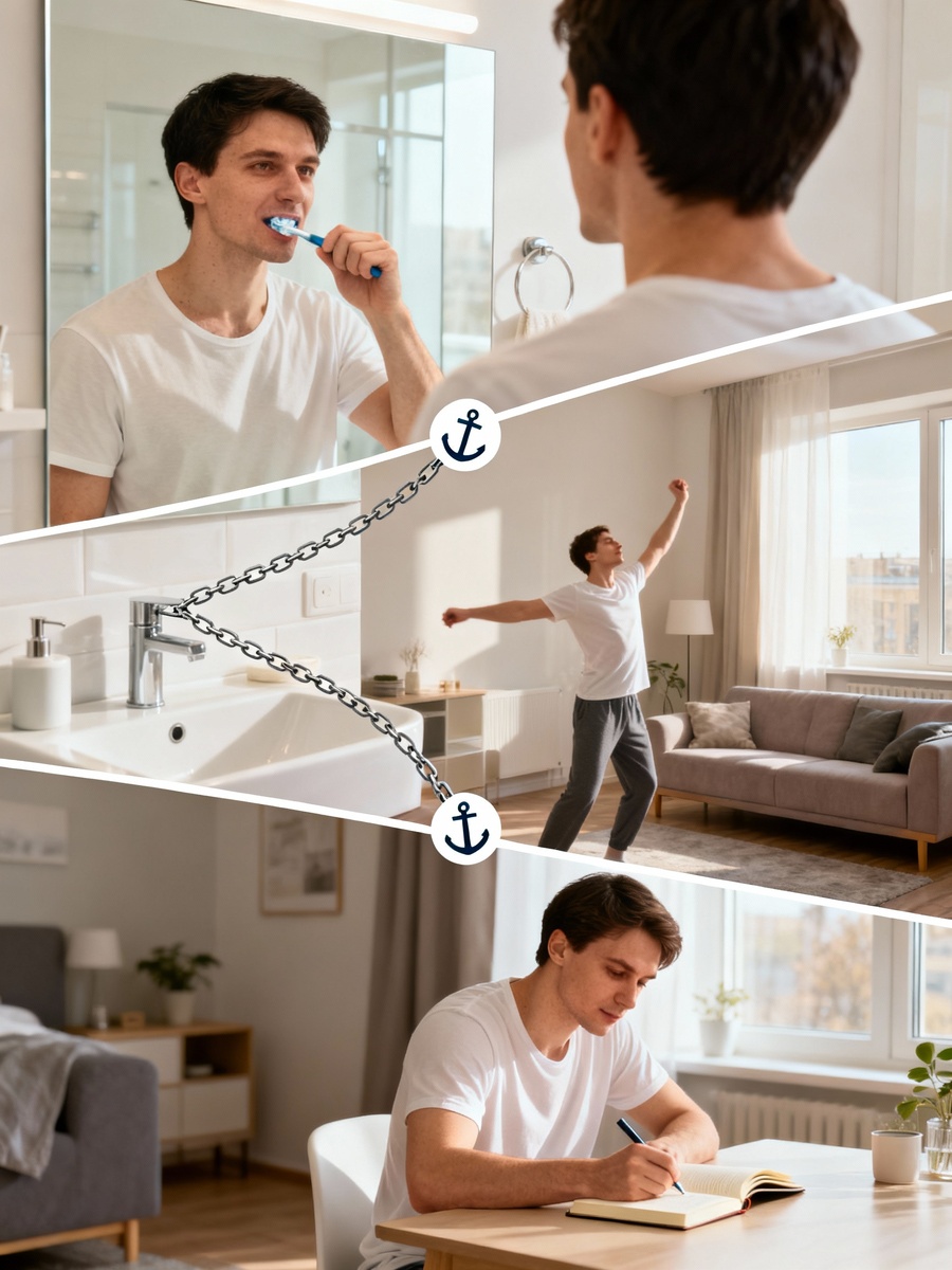 Решение — метод связывания привычек (Habit Stacking), основанный на нейронауке и поведенческой психологии. Суть проста: прикрепить новую привычку к уже существующей, создав надежную нейронную цепочку "триггер → действие".