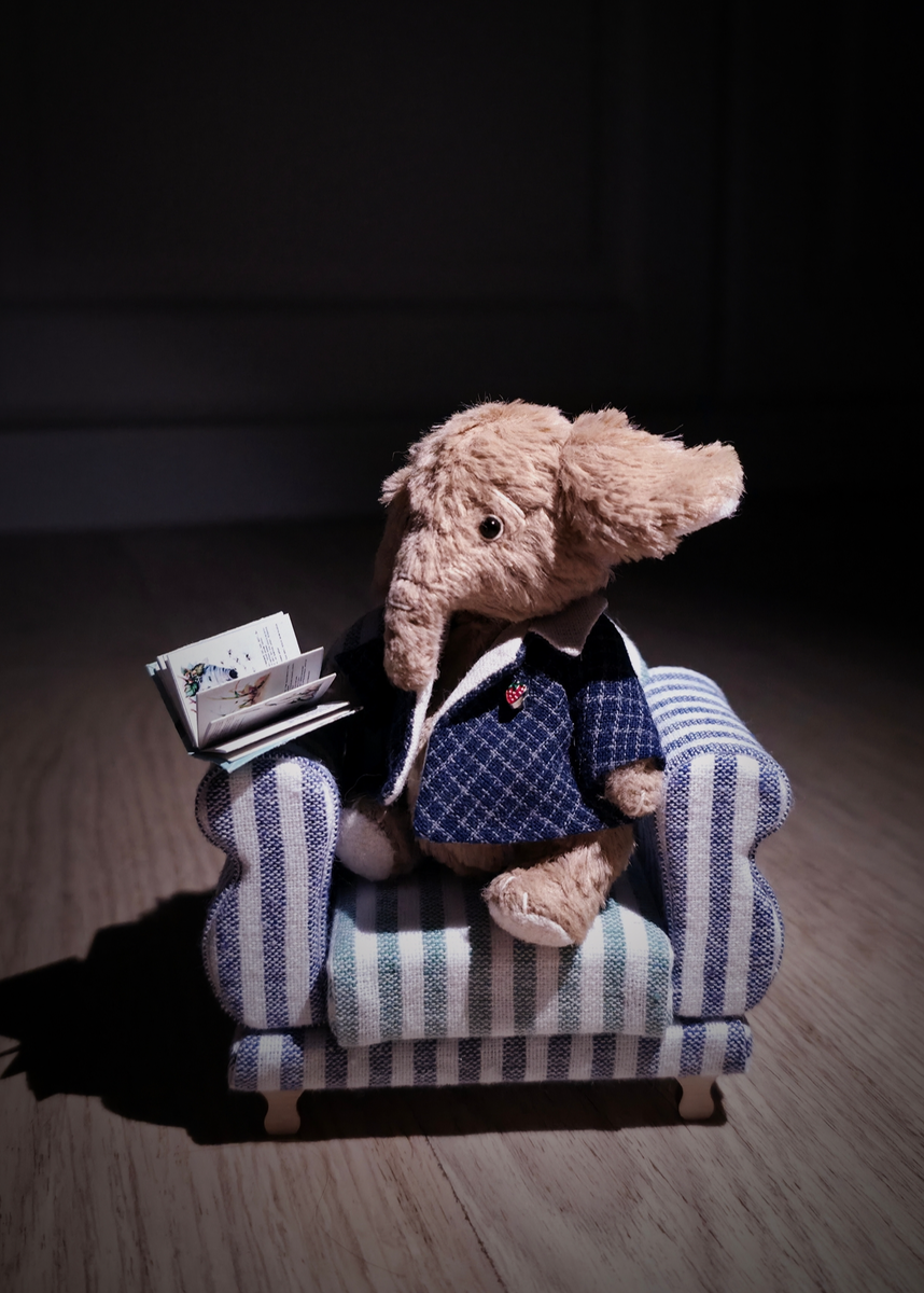 В комнате, где лампа светила мягким кругом света, маленький слоник сидел в своём огромном уютном кресле. Кресло было такое нежное и мягкое, что казалось- оно обнимает его своими полосатыми подлокотниками. Слоник раскрыл крошечную книжку. На страницах жили другие звери: зайцы, медвежата, совы, которые отправлялись в волшебные путешествия. И каждый раз, когда слоник переворачивал страницу, ему казалось, что он тоже шагает по этим сказочным тропинкам. Вот он вместе с зайцем прыгает по облакам… вот медвежонок приглашает его на чай… вот сова показывает звёздные дорожки, которые видны только тем, кто читает перед сном. Слоник улыбался, укутываясь в мягкие объятия кресла. А когда последняя страничка шёпотом сказала: «До завтра», слоник закрыл книжку, вздохнул от удовольствия и понял, что именно такие вечера- самый настоящий отдых. И пока слоник шёл выключать свет, он уже знал: завтра в этом большом уютном кресле он отправится в новые путешествия. Книжка самая настоящая. Слоник: Рост 9 см, пре
