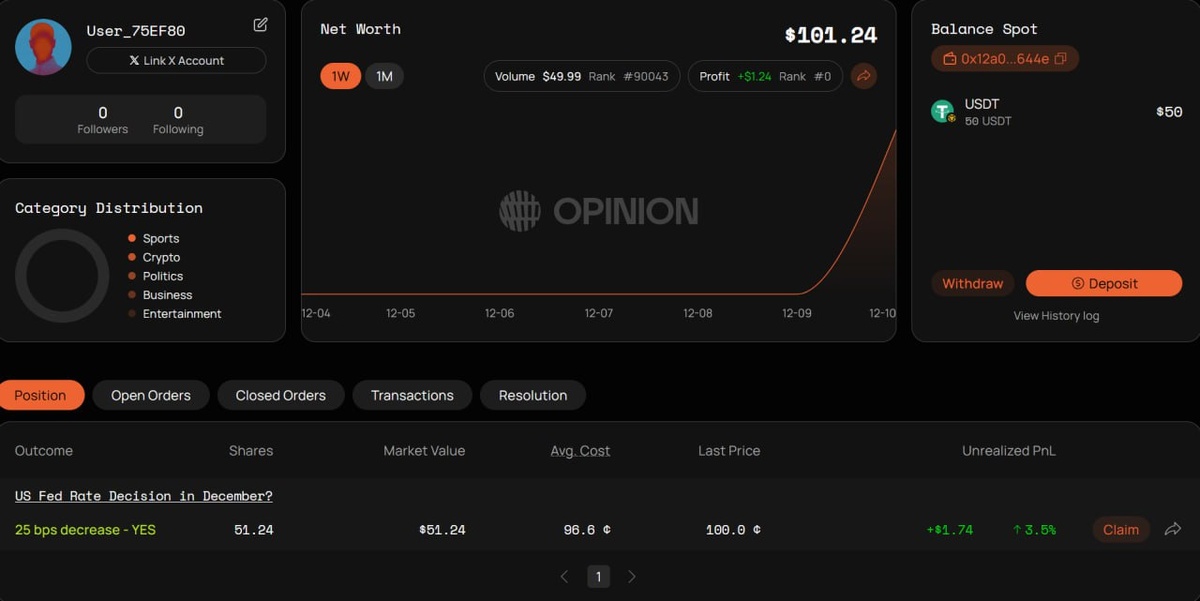 В ответ на пост Ну что, друзья ✨ Сегодня у нас небольшой апдейт: ставку снизили на 25 б.п., как и ожидалось. И я решила протестировать, как это отразится на бирже прогнозов Opinion. Поставила символические $50 — чисто ради эксперимента — и в итоге получила +3,5% прибыли. Небольшой результат, но приятно, когда твои ожидания подтверждаются.💰 Хочу подчеркнуть: такие штуки я рассматриваю только как дополнительный способ подзаработать, когда есть свободные деньги и уверенность в сценарии. Главное — не увлекаться и всегда помнить о рисках. Просто делюсь своим опытом — вдруг кому-то будет интересно 💛