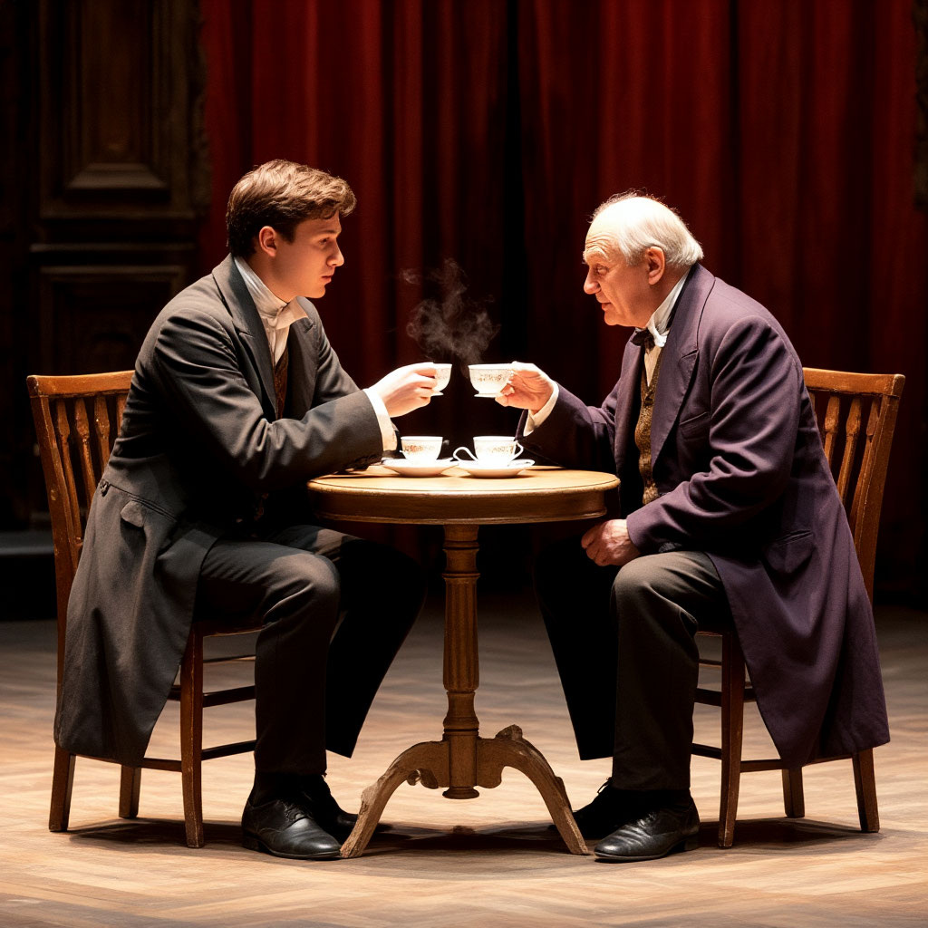(Решительно выпивает рюмку коньяку, потом сжимает губы, вскидывает брови, нюхает рюмку, встаёт, подходит к буфету, берёт бутылку, наливает сначала Фамусову, затем себе, оба с удовольствием маленькими глотками смакуют коньяк)