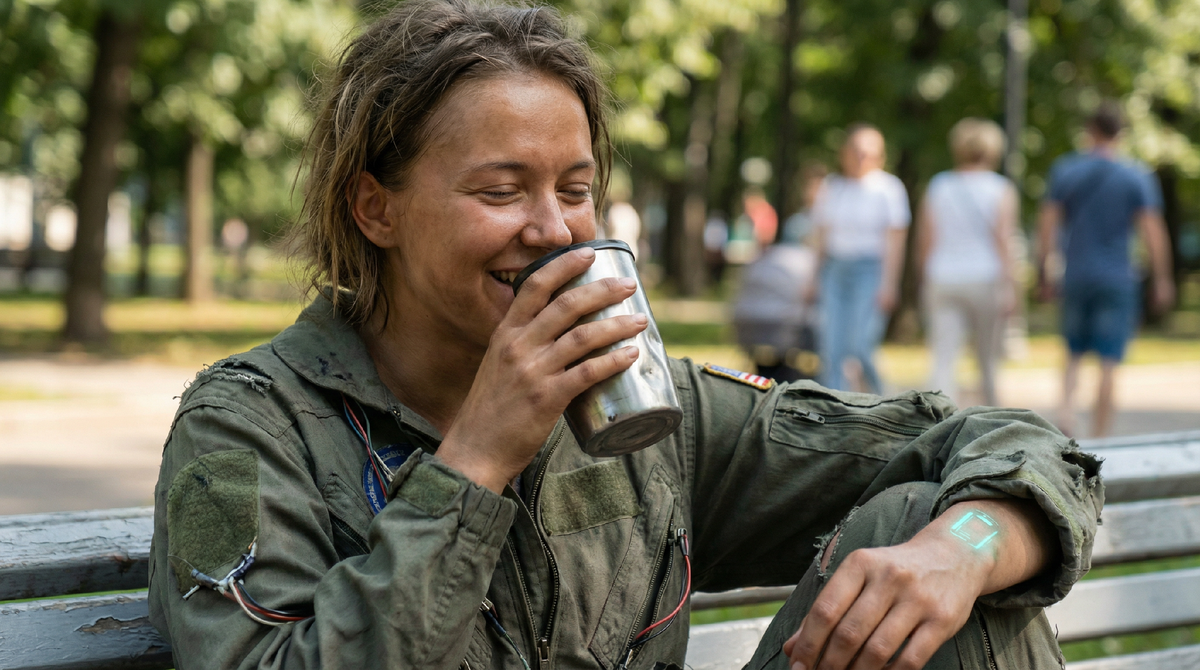 Девушка появилась из ниоткуда. Только что дорожка была пуста, моргнул — и она уже стоит. Странная. Одета в какой-то комбинезон цвета жухлой листвы, ткань словно живая — пористая, дышащая. На ногах — не то кроссовки, не то плетеные лапти из пластика. А лицо… Лицо было молодое, лет двадцати, но глаза смотрели так, будто она прожила три жизни.