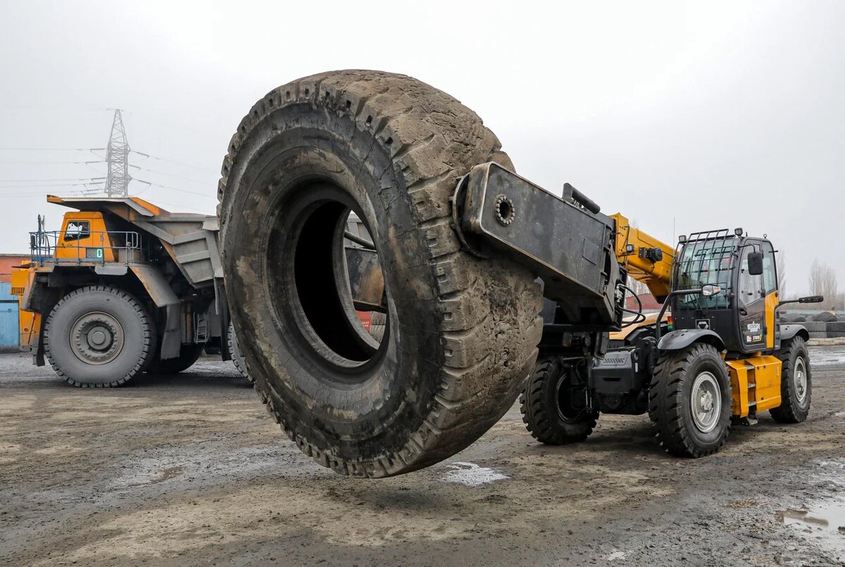 Было — стало Шина самосвала грузоподъёмностью 180-220 тонн весит около трёх тонн. Для замены увесистой «обуви» карьерных гигантов используют спецтранспорт.