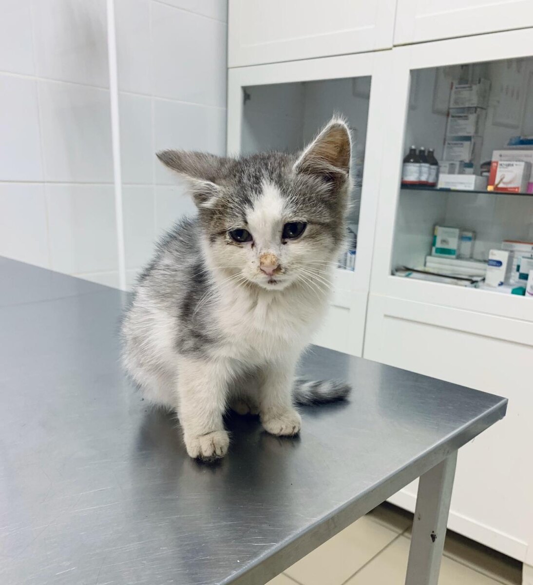 Мишку подобрали маленьким облезлым котёнком, сидел около входа метро. Был какой-то взерошенный, глаза слезились, в ушах чернота и голоса совсем не было, даже мяукать не мог, хрипел только.