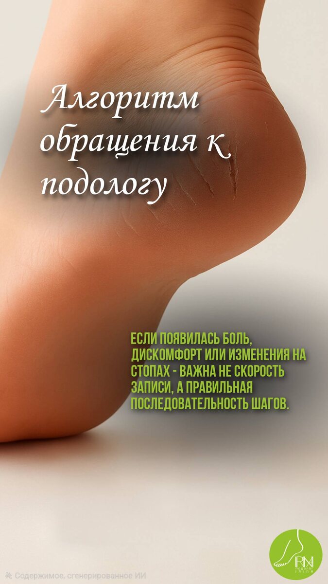 АЛГОРИТМ ОБРАЩЕНИЯ К ПОДОЛОГУ — ЧТО ДЕЛАТЬ, ЕСЛИ ПОЯВИЛАСЬ ПРОБЛЕМА СО СТОПАМИ 1️⃣ Оценить симптомы Если есть боль, уплотнение, изменение ногтя, трещины, подозрение на грибок, бородавку или что-то «непонятное» — это сигнал. Самостоятельно ставить диагноз не нужно (предположение). 2️⃣ Не трогать и не срезать Не применять кислоты, пластыри, «домашние методы». Это может смазать картину и усложнить работу специалисту (общая практика). 3️⃣ Собрать сведения для врача/подолога Подготовить: — фото в хорошем освещении; — когда появилась проблема; — болит/не болит; — были ли попытки самостоятельного лечения. 4️⃣ Записаться к подологу Лучше выбирать специалиста, который работает по протоколам, с инструментами стерилизации и умеет вести сложные случаи (модель: общая рекомендация). 5️⃣ Пройти первичную консультацию Подолог: — определяет причину; — объясняет, что делать; — выбирает метод коррекции или лечения; — назначает домашний уход. 6️⃣ Следовать рекомендациям Важен уход и дисциплина: част