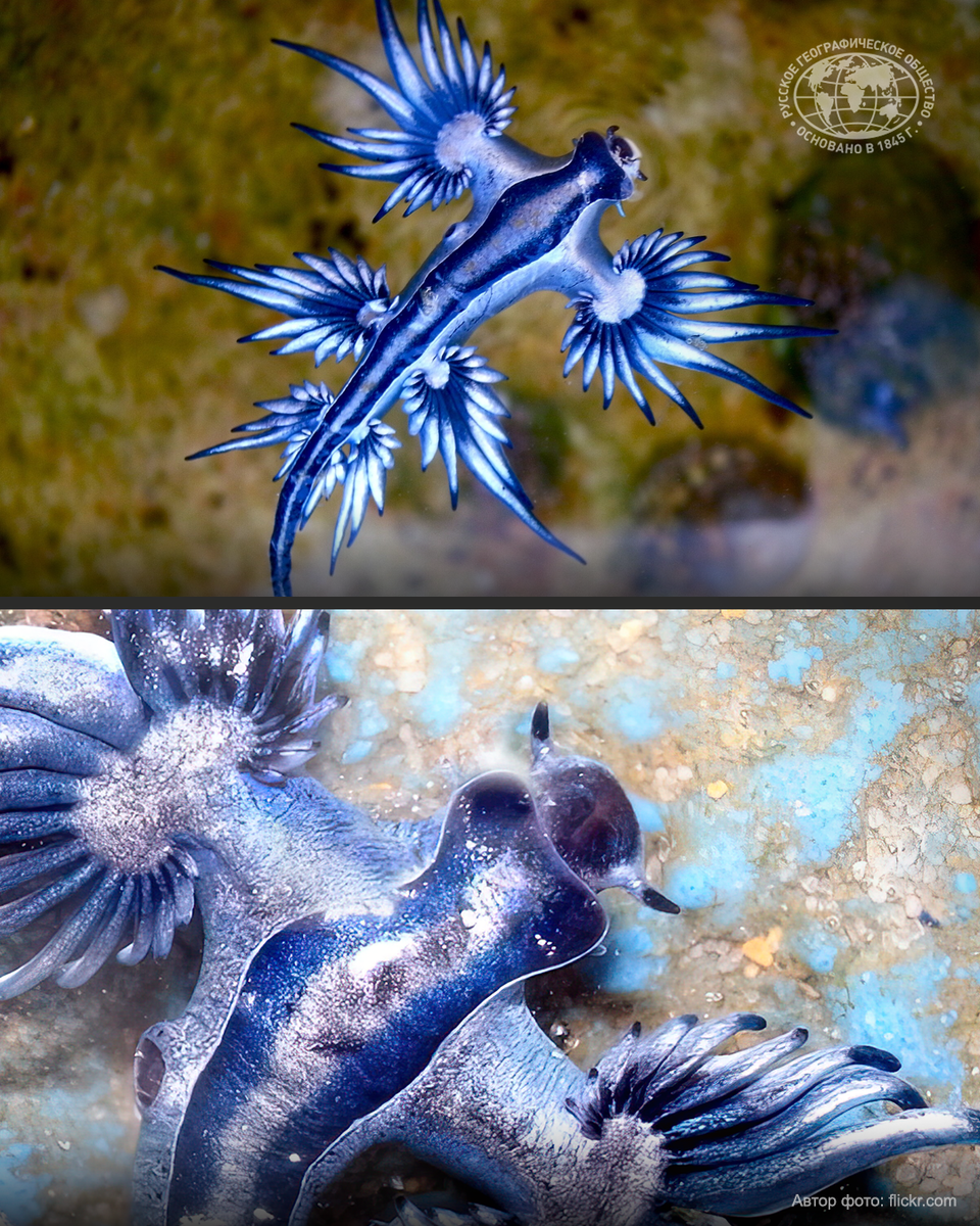 Обитает в тёплых водах Атлантики, Индийского и Тихого океанов 🔵 Этого голожаберного брюхоногого моллюска ещё называют морским, или голубым драконом 🔵 В длину всего около 3 см Фото: wikipedia.org 🔵 Гермафродит: у каждой особи есть и мужские, и женские половые органы 🔵 Питается ядовитыми медузами — португальскими корабликами, яд которых скапливается у дракона в отростках (цератах) 🔵 В момент опасности «выстреливает» накопившемся ядом — у человека он вызывает ожог и даже может привести к летальному исходу! 🔵 Этот вид крайне редко встречается учёным, однако способность дракона противостоять яду могла бы помочь в развитии медицины Фото: Таро Тейлор, Австралия 🔵 На фото, кстати, видна не спина моллюска, а его нога (да, она у него всего одна)! Моллюск удерживает пузырь воздуха в желудке и за счёт этого переворачивается под водой вверх ногой 🔵 Грубо говоря, он ползёт по плёнке воды вверх тормашками #СредаРГО — каждую среду мы рассказываем об уд