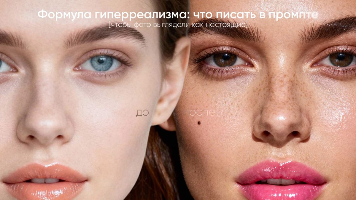 Мы уже общались на эту тему, но сегодня мы поговорим о более интересных приемах, не используя никакие дополнительные сервисы. Первый и самый очевидный шаг — выбрать одну из самых прогрессивных генеративных моделей, которые также могут работать с товарами. На сегодняшний день это Nano Banana PRO или Seedream 4.5. Помимо описания внешности человека нужно добавить описание освещения. Например: Прямая фронтальная вспышка освещает лицо высокой интенсивностью, создавая резкие глянцевые блики, подчеркивая эффект влажного блеска на губах и сияющей коже, а также видимые микродетали, поры, микроволоски и естественные неровности. И самое интересное: если в промпт добавить модель камеры, на которую производилась съемка, то результат вас удивит. Снимок был сделан на камеру Pentax K-1 Mark II Подробнее с примерами таких промптов и результатами генераций вы можете ознакомиться в нашем гайде. Если вам заходит такой контент, то ставьте 🔥 и на следующей неделе подготовим гайд с примерами промптов, кон