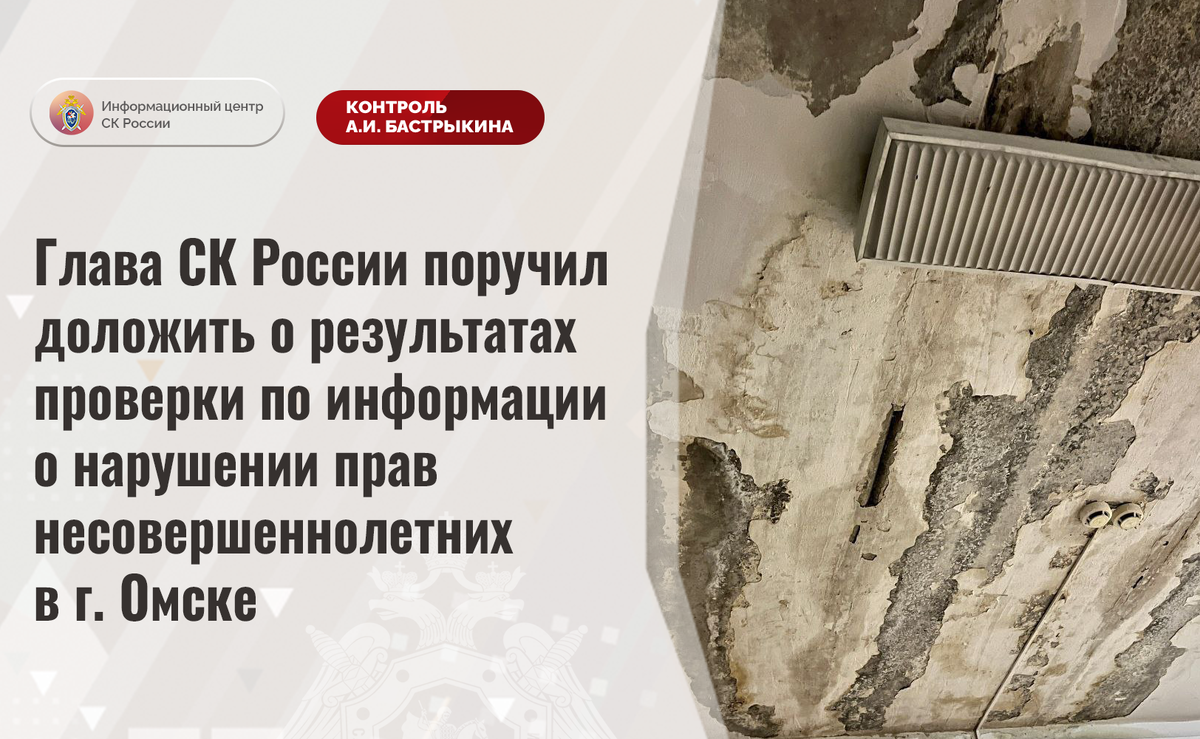 Глава СК России поручил доложить о результатах проверки по информации о нарушении прав несовершеннолетних в г. Омске В сети Интернет сообщается о нарушении прав учеников одной из школ в городе Омске. В здании учебного заведения 1972 года постройки длительное время протекает кровля, потолочные перекрытия и стены разрушаются, из-за сырости в помещениях образовалась плесень. Многочисленные обращения в компетентные службы результатов не принесли. В СУ СК России по Омской области по данному факту организована процессуальная проверка. Председатель Следственного комитета Российской Федерации Александр Иванович Бастрыкин поставил ход процессуальной проверки на контроль в центральном аппарате ведомства и поручил руководителю СУ СК России по Омской области Виталию Владимировичу Батищеву доложить о промежуточных результатах процессуальной проверки и принятом по итогам решении. #СледственныйКомитет #СКРоссии #СКР #ИЦСКР #ИнформационныйЦентр #АлександрБастрыкин #ПредседательСКР #КонтрольПредседате