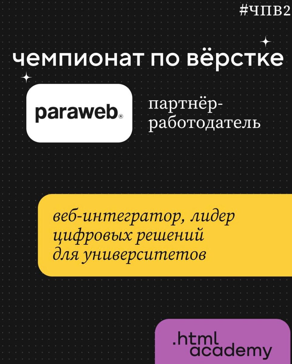 Продолжаем знакомиться с партнёрами второго сезона чемпионата по вёрстке. #чпв2 👍 Paraweb — партнёр-работодатель Paraweb — веб-интегратор и лидер цифровых решений для университетов. Компания создаёт и поддерживает информационные системы для образовательных организаций, корпораций и органов государственной власти, развивая электронную образовательную среду и связанные цифровые сервисы. 👍 GT Media — партнёр-работодатель GT Media — digital-агентство полного цикла из Санкт-Петербурга. С 2014 года команда занимается комплексным продвижением бизнеса: разрабатывает и продвигает сайты, ведёт проекты в социальных сетях, создаёт креативный контент и подключает рекламные инструменты под задачи брендов. 👍 ОФЭП — партнёр-работодатель ОФЭП — агентство интернет-маркетинга, которое помогает бизнесу продвигать товары и услуги в цифровой среде. Команда разрабатывает сайты и занимается продвижением: SEO, маркетплейсы, PR и другие инструменты интернет-маркетинга. https://htmlacademy.ru/contest/2
