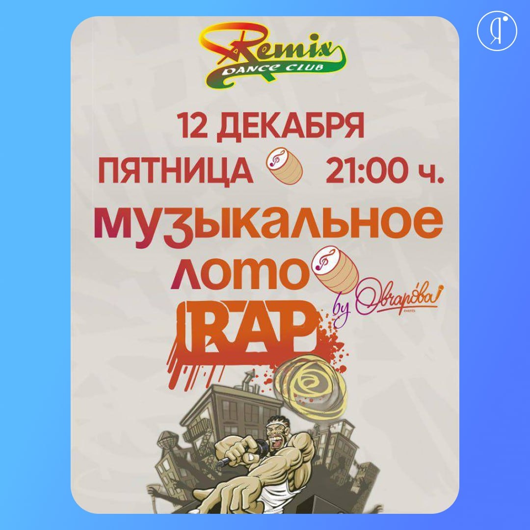 Музыкальное RAP-лото #Вечером Правила простые: У каждого участника будет большой бланк с песнями, в котором нужно зачеркивать композиции Первый, кто соберёт БИНГО (закрытие строки из 6 клеток)— забирает приз! Во время игры угадывать ничего не нужно, остаётся только наслаждаться музыкой, веселиться и зачёркивать поля 12 декабря | 21:00 «Remix», Авиационная, 2/2 Справки и запись: +7 (914) 233-48-94 Online Якутия | Ждем вас в МАХ