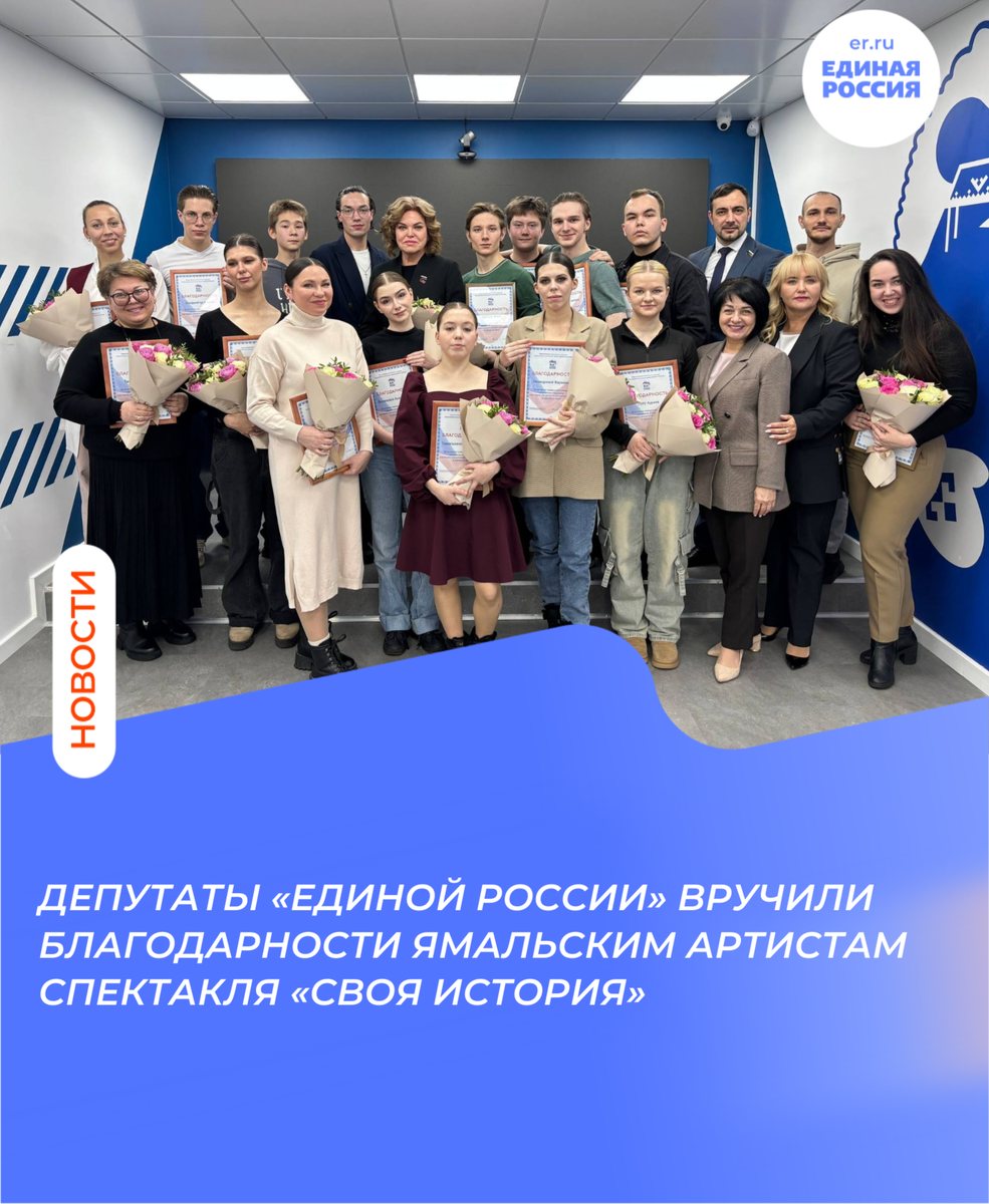 Сегодня, 10 декабря, в Штабе общественной поддержки «Единой России» депутаты Думы Тюменской области от Ямала Ирина Соколова и Денис Ващенко поздравили ребят из центра «Геолог» и студентов Ямальского колледжа с показом спектакля, которая тронула сердца тысячи северян. Спектакль «СВОя история» рассказывает историю о молодых людях, которых судьба поставила перед непростым выбором: поддаться страху или выполнить долг перед страной. Депутаты вручили ребятам благодарности от «Единой России» и подарки от Тюменской областной Думы. В конце мероприятия ребята показали отрывок из своего спектакля про любовь двух юных людей, которая разворачивается во время войны. «Совсем недавно состоялась премьера этого спектакля. Артисты Центра «Геолог», студенты Ямальского многопрофильного колледжа и школьники показали историю семейной пары из Салехарда, основанную на реальных событиях. Герои добровольцами ушли на специальную военную операцию, Кристина работала медсестрой, а Родион начинал рядовым штурмовиком