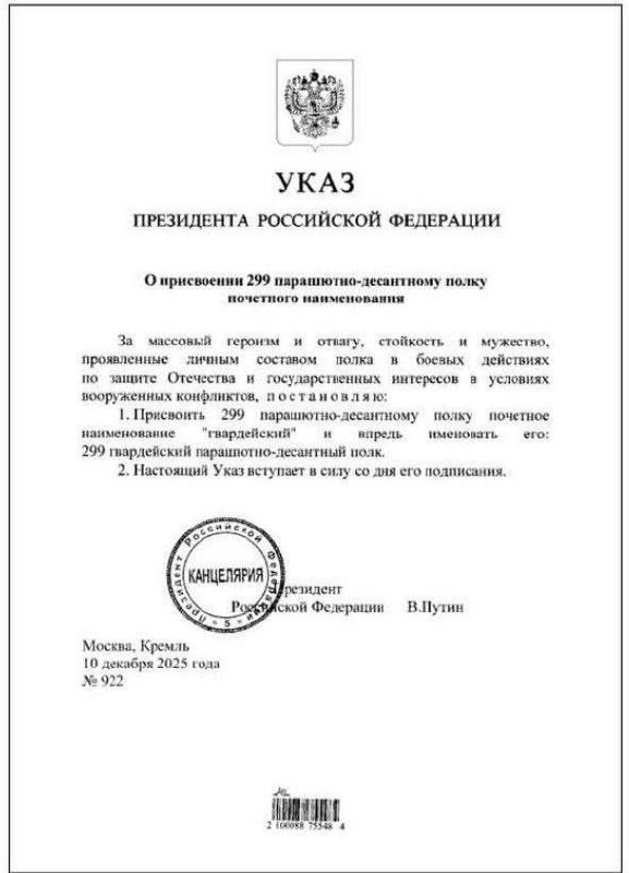 🪂 Сводка ▫️▫️▫️. 🪂 Рязанские десантники 137 полка в Сумской области устраивают настоящую охоту на вражеские тяжёлые дроны - бомбардировщики, тем самым поддерживают наступление наших штурмовых групп. 🪂 Ивановские десантники 1 пдб 217-го гв. полка в Сумской области уничтожили несколько вражеских пунктов управления БПЛА, в числе которых совершались запуски на территорию России. 🪂 На Запорожском направлении гвардейское соединение ВДВ группировки "Днепр" применив технику таран ударными FPV-дронами нейтрализовали боевые машины врага и тяжёлые грузовые копторы, которые использовались для снабжения противника. 🪂 Совсем недавно состоялась премьера фильма, который посвящен ветеранам и бойцам 104-ой гвардейской десантно - штурмовой дивизии ВДВ. Фильм "Непобедимые" о героях с передовой. Об их жизненных принципах, силе духа, семейных традициях и беззаветной любви к Родине. Фильм про то, как вместе служат сын и отец, про братство и товарищество, про хрупкую девушку медика спассающую бойцов