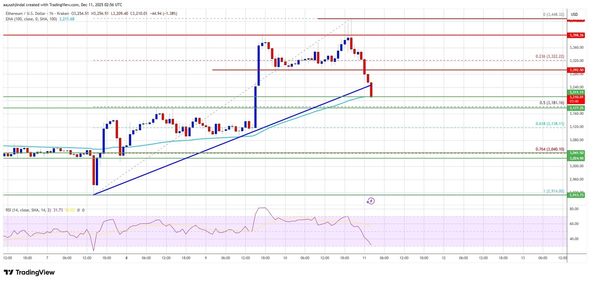 🎯 Ethereum отступает от сопротивления — начинается ли разворот тренда? 📉 Цена Ethereum корректируется после достижения $3,448 и может продолжить снижение. Произошел пробой бычьей линии тренда с поддержкой на $3,240. Сейчас ETH торгуется около $3,200 и 100-часовой скользящей средней. 📊 Ключевые моменты: - Ethereum отступает от сопротивления $3,450 после достижения пика в $3,448. - Пробит бычий тренд с поддержкой на $3,240. - Текущая цена около $3,200, ниже 23,6% коррекции Фибоначчи. - Ключевые уровни поддержки: $3,200, $3,180 (50% Фибо), $3,150, $3,050, $3,000. - Ключевые уровни сопротивления: $3,250, $3,300, $3,320, $3,400, $3,450, $3,500. - MACD и RSI указывают на медвежий импульс.