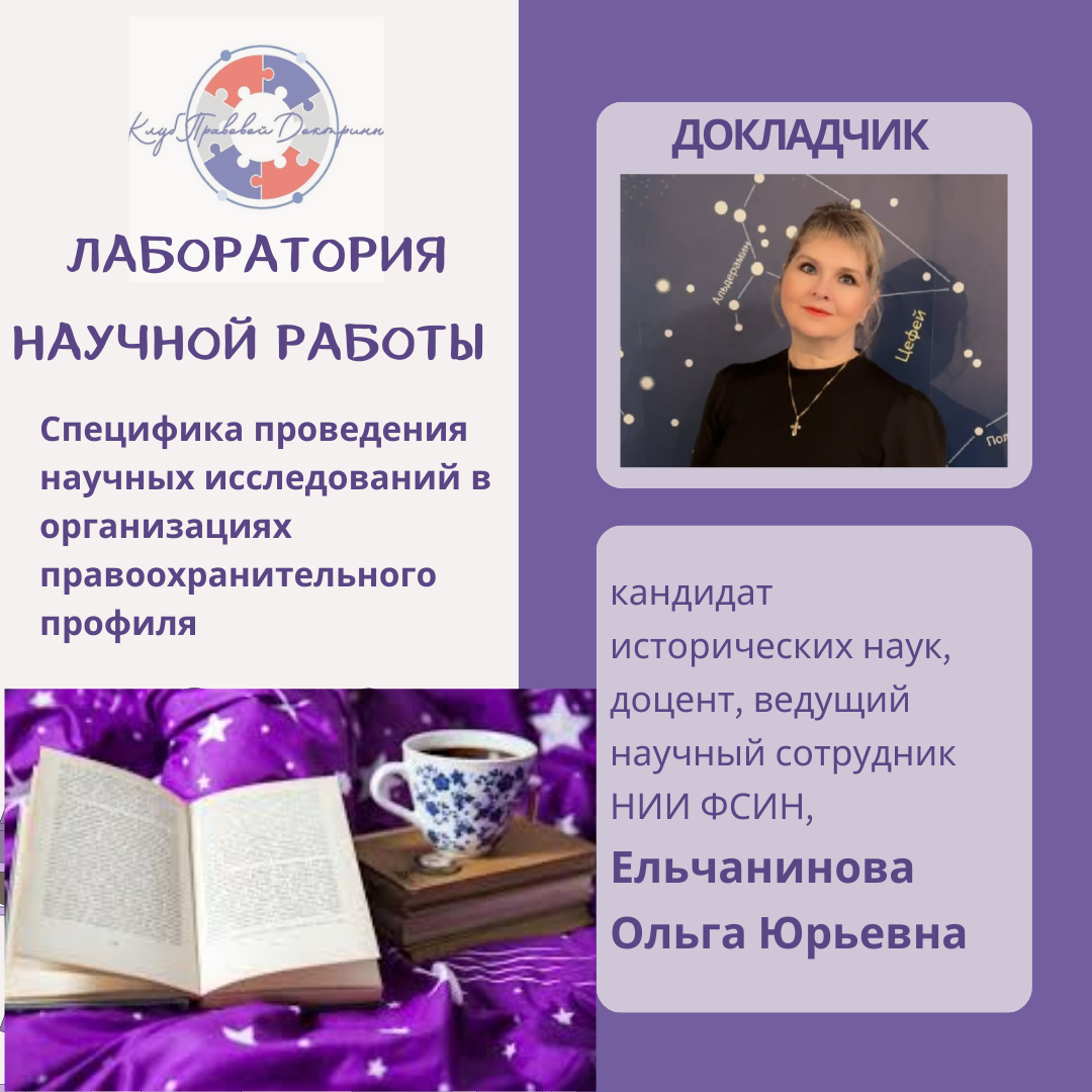13.12.2025 в 19 часов в Лаборатории научной работы Клуба Правовой Доктрины с сообщением «Специфика проведения научных исследований в организациях правоохранительного профиля» выступит Ельчанинова Ольга Юрьевна. Ведущий научный сотрудник Научно-исследовательского института Федеральной службы исполнения наказаний, полковник внутренней службы в отставке, кандидат исторических наук, доцент поделится своим профессиональным опытом, прошедшая путь от аудитории университета - к службе в уголовно-исполнительной системе, а затем — обратно в науку, но уже с иным взглядом. На протяжении 35 лет работала одновременно в двух мирах: в высшей школе -как исследователь в области историко-теоретико-правовых проблем; в правоохранительной системе - на должностях, связанных с аналитикой и подготовкой кадров и их правовым сопровождением. Этот путь позволил Ольге Юрьевне увидеть то, что остаётся за кадром при традиционном академическом подходе: как теоретико-правовые знания работают в реальной оперативной и управленческой практике; как прошлое становится инструментом легитимации текущей политики и институциональной идентичности.